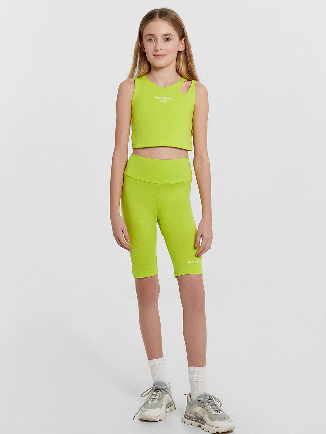 Этот комплект для девочек идеально подходит для занятий спортом! Топ прилегающего кроя с круглой горловиной обеспечивает комфорт и поддержку во время активности. Фигурный вырез на левом плече добавляет стильный и современный акцент, делая образ более интересным. Велосипедки облегающего кроя с эластичным поясом гарантируют надежную посадку и свободу движений, что особенно важно для спортивных занятий. А длина до колена и высокая посадка подарят удобство и уверенность во время тренировок. Изготовленный из мягкого и дышащего материала, этот комплект обеспечивает комфорт и удобство на протяжении всего дня. Он не только функционален, но и выглядит стильно, позволяя юным спортсменкам чувствовать себя уверенно и привлекательно!
