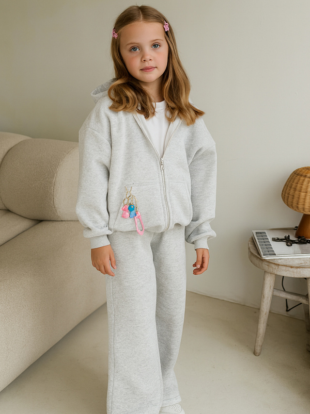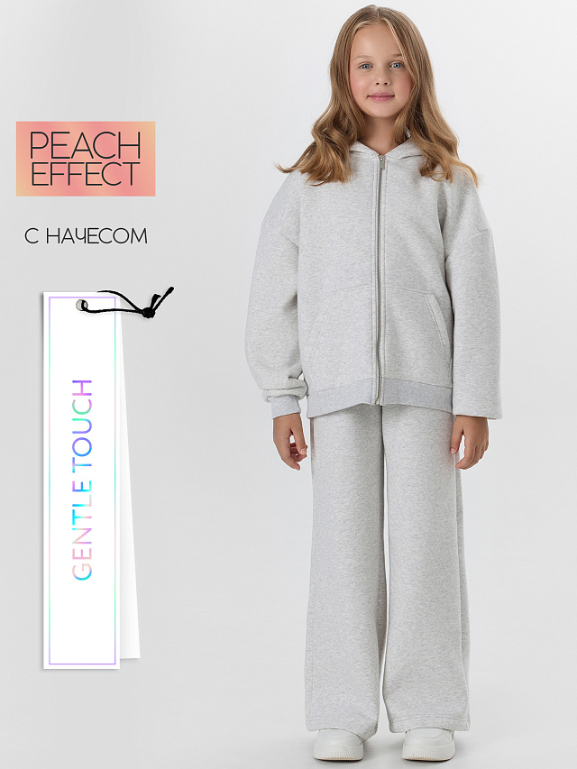 Серый костюм для девочек из коллекции Gentle Touch — идеальный комплект для комфорта и активного образа жизни. Модель выполнена из инновационного футера с пич-эффектом, который создает на поверхности ткани бархатистую текстуру, приятную для детской кожи.