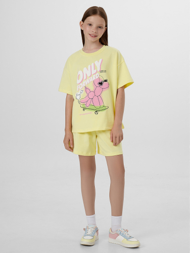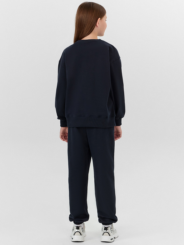 Джемпер свободного силуэта. Рукава длинные, втачные. Линия плеча спущена. Перед и спинка цельнокроенные. Горловина круглой формы обработана обтачкой из рибаны. По низу рукавов и джемпера притачены манжеты и пояс из рибаны. Брюки свободного силуэта. Посадка средняя. Цельнокроеный пояс с эластичной тесьмой внутри. По поясу выполнены три декоративные строчки. По низу брюк застрочена внутрь эластичная тесьма.