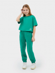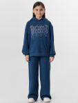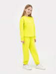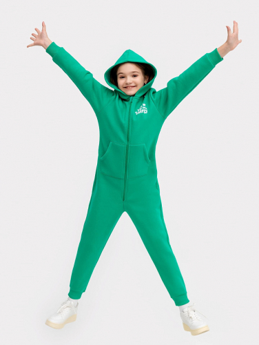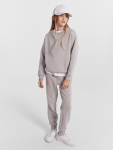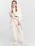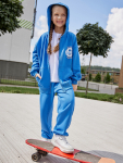 Костюм из жакета и брюк выполнен из трикотажного футера, который сохраняет тепло, оставаясь легким и дышащим. Жакет на молнии с капюшоном и спущенными плечами удобно надевается и защищает от ветра. Брюки на эластичном поясе со шнурком обеспечивают идеальную посадку и свободу движений.