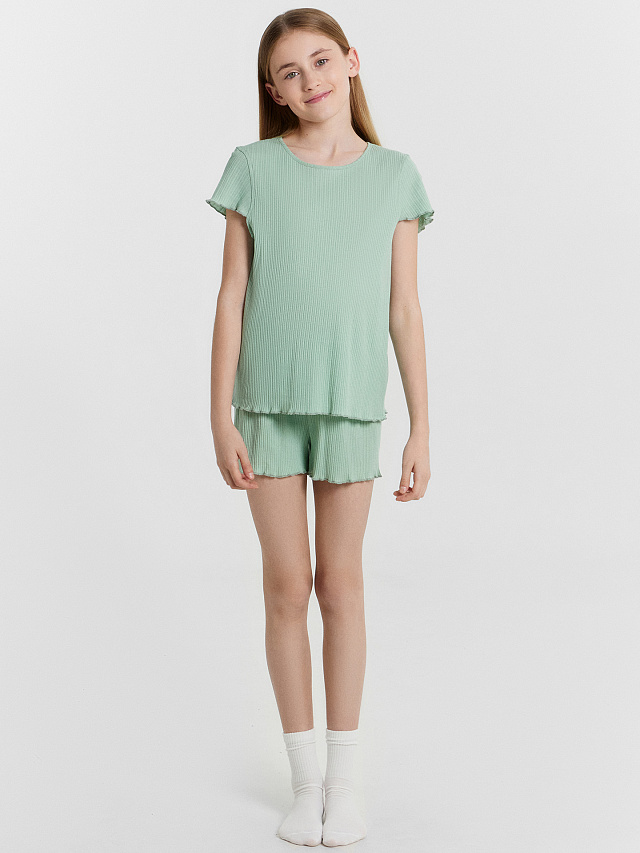 Комплект состоит из футболки и шорт. Футболка прямого силуэта. Перед и спинка цельнокроенные. Горловина круглая окантована бейкой из основного полотна. Низ рукавов и изделия обработаны микрооверлоком.