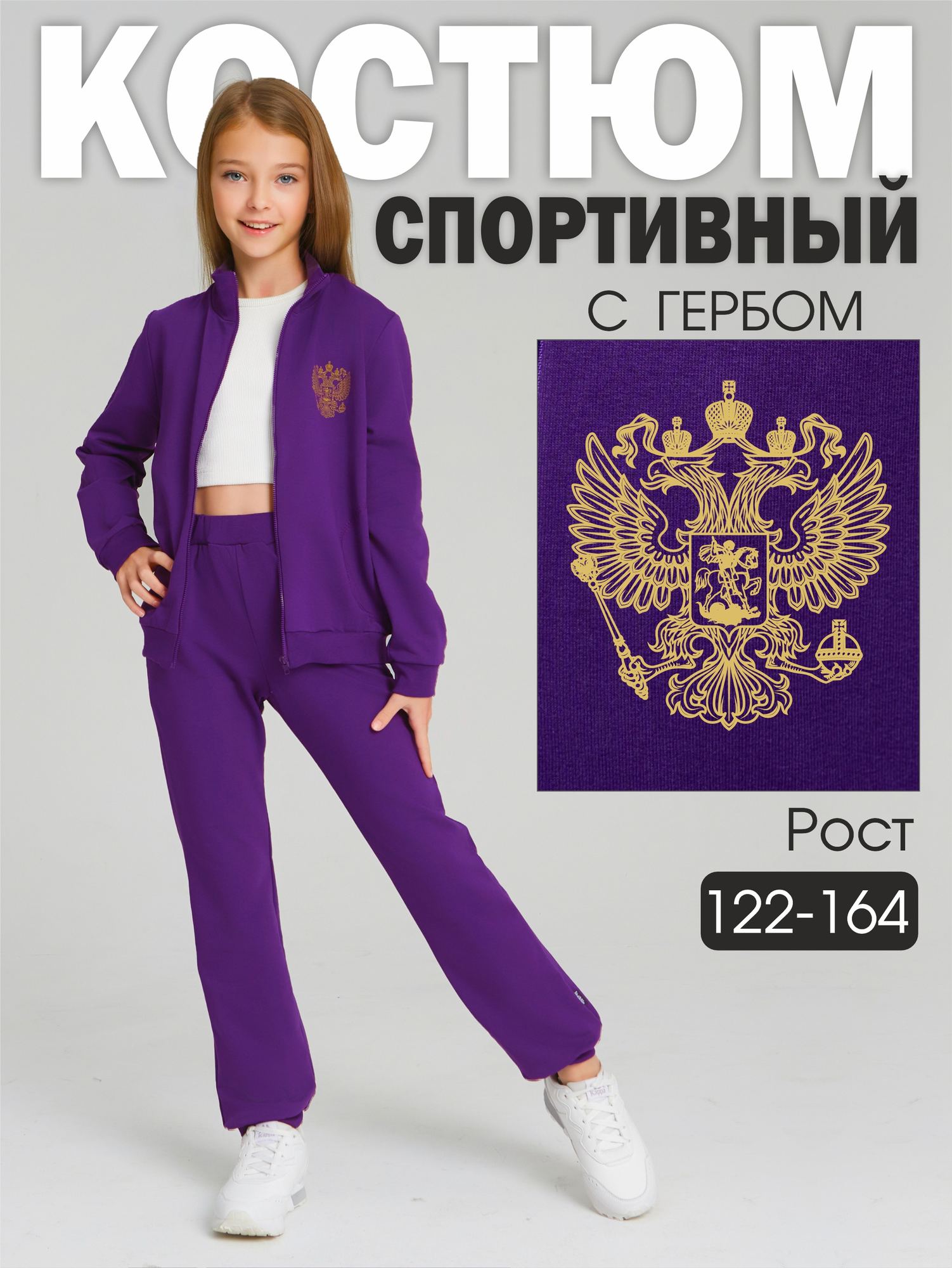 Отличный костюм из футера фиолетового цвета для девочки, состоящий из джемпера на молнии, с боковыми карманами и брюк с манжетами снизу. Изделие выполнено из трикотажа премиального качества - ПЕНЬЕ, с содержанием хлопка более 92%