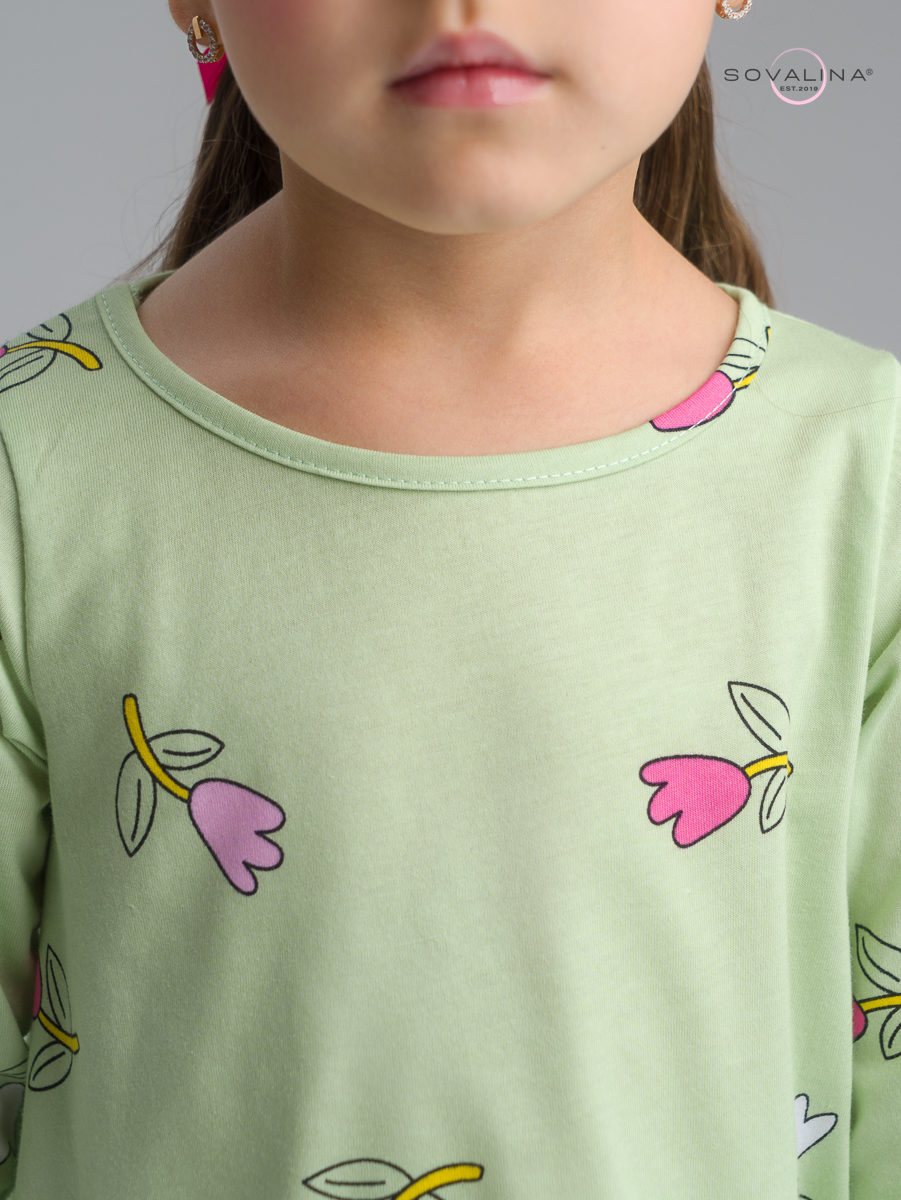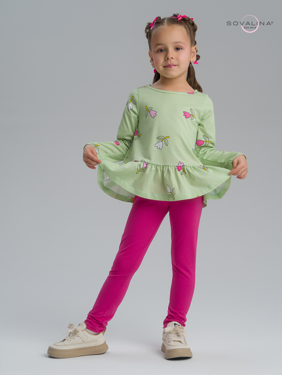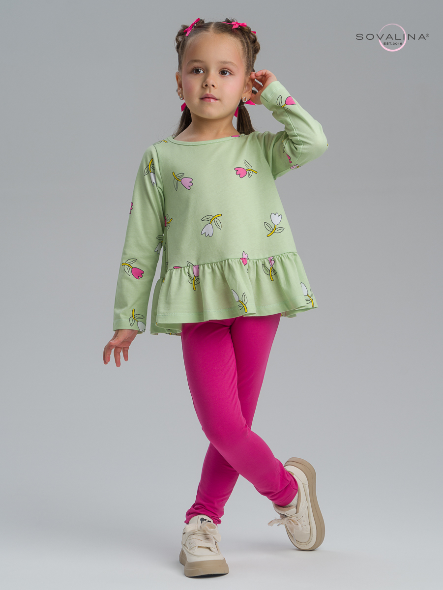 Яркий трикотажный костюм для девочки ТМ SOVAlina. Включает в себя тунику с баской и однотонные лосины на эластичной резинке, которая не давит на поясе. Облегченный дышащий материал высокого качества из тонкого хлопка, обеспечивает максимальный комфорт для ребенка. Детский легкий комплект двойка с длинным рукавом подойдет для летних и весенних прогулок. Нарядный и красивый костюмчик с лонгсливом будет отличным выбором на осенний утренник и посещения детского сада. Кофту и штаны можно носить как вместе так и по отдельности с другими вещами, создавая модные и стильные комплекты одежды на весну и прохладное лето.