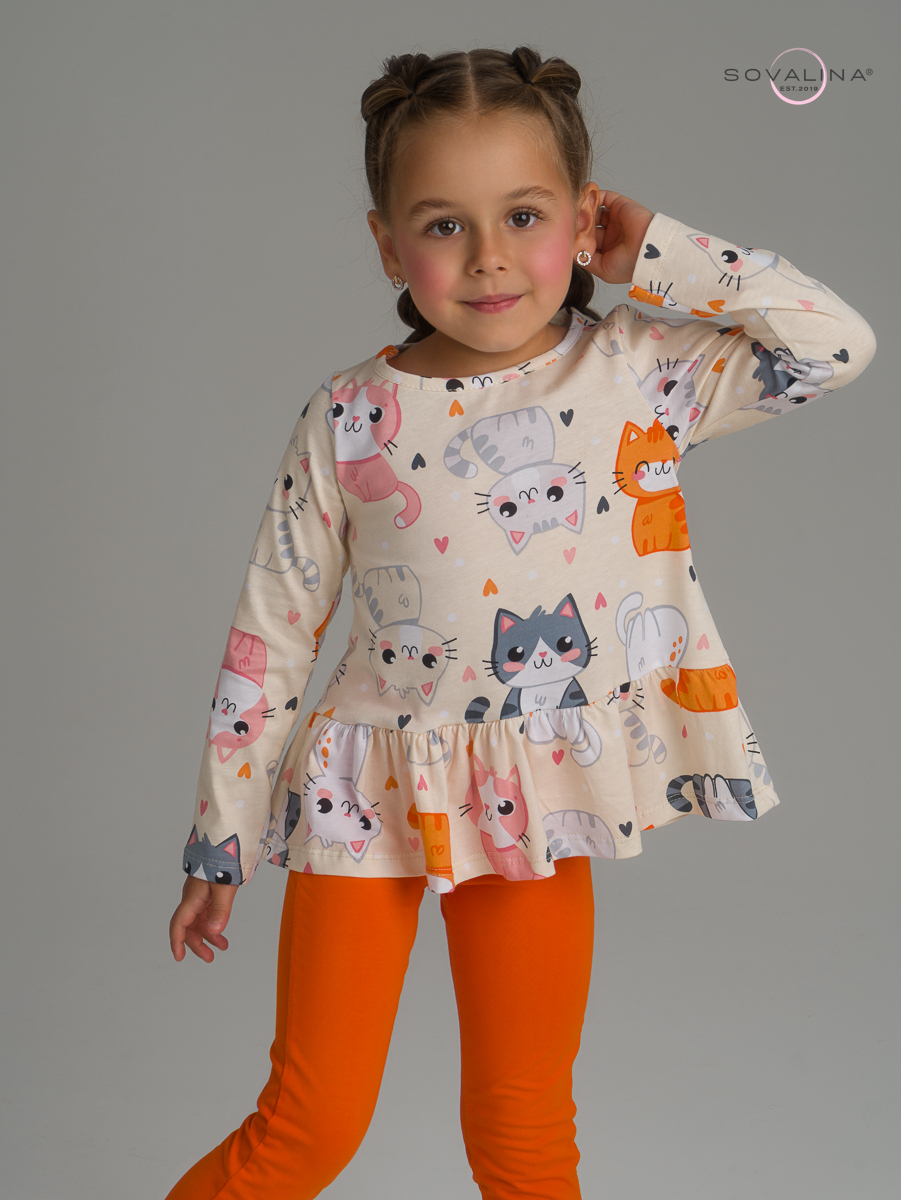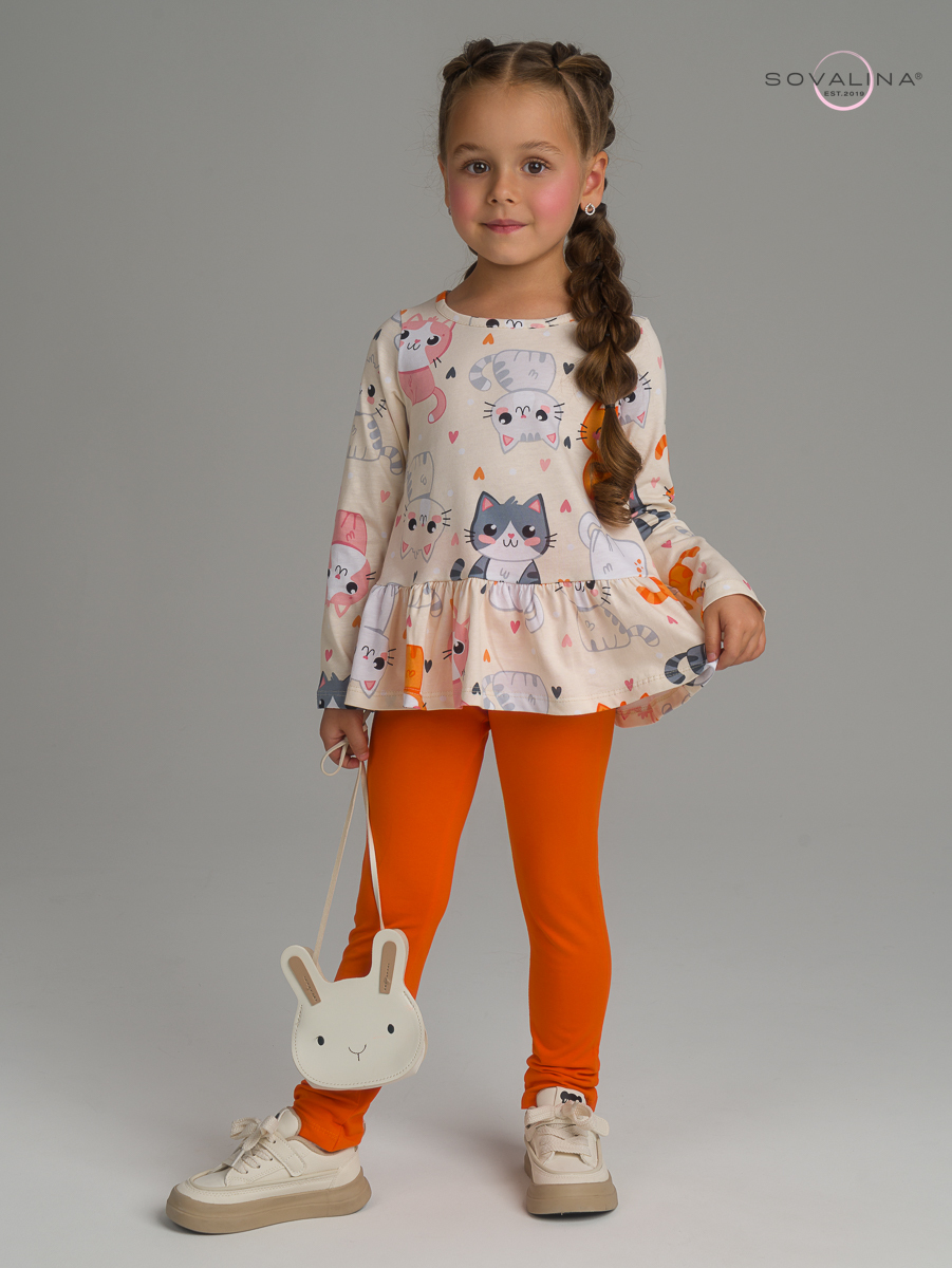 Яркий трикотажный костюм для девочки ТМ SOVAlina. Включает в себя тунику с баской и однотонные лосины на эластичной резинке, которая не давит на поясе. Облегченный дышащий материал высокого качества из тонкого хлопка, обеспечивает максимальный комфорт для ребенка. Детский легкий комплект двойка с длинным рукавом подойдет для летних и весенних прогулок. Нарядный и красивый костюмчик с лонгсливом будет отличным выбором на осенний утренник и посещения детского сада. Кофту и штаны можно носить как вместе так и по отдельности с другими вещами, создавая модные и стильные комплекты одежды на весну и прохладное лето. Верх 100% хлопок / Низ 92% хлопок; 8% эластан