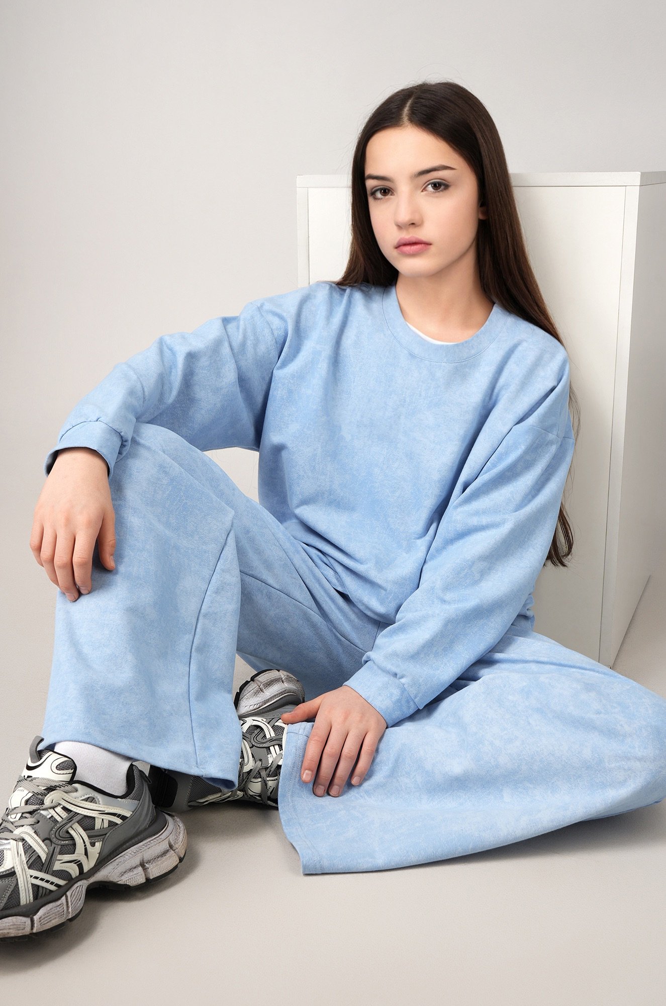 Детский костюм для девочки и девочки подростка голубого цвета с вареным эффектом — стиль без усилий. Глубокий тон и свободный силуэт создают выразительный повседневный образ, а плотный футер даёт ощущение уюта в прохладную погоду.