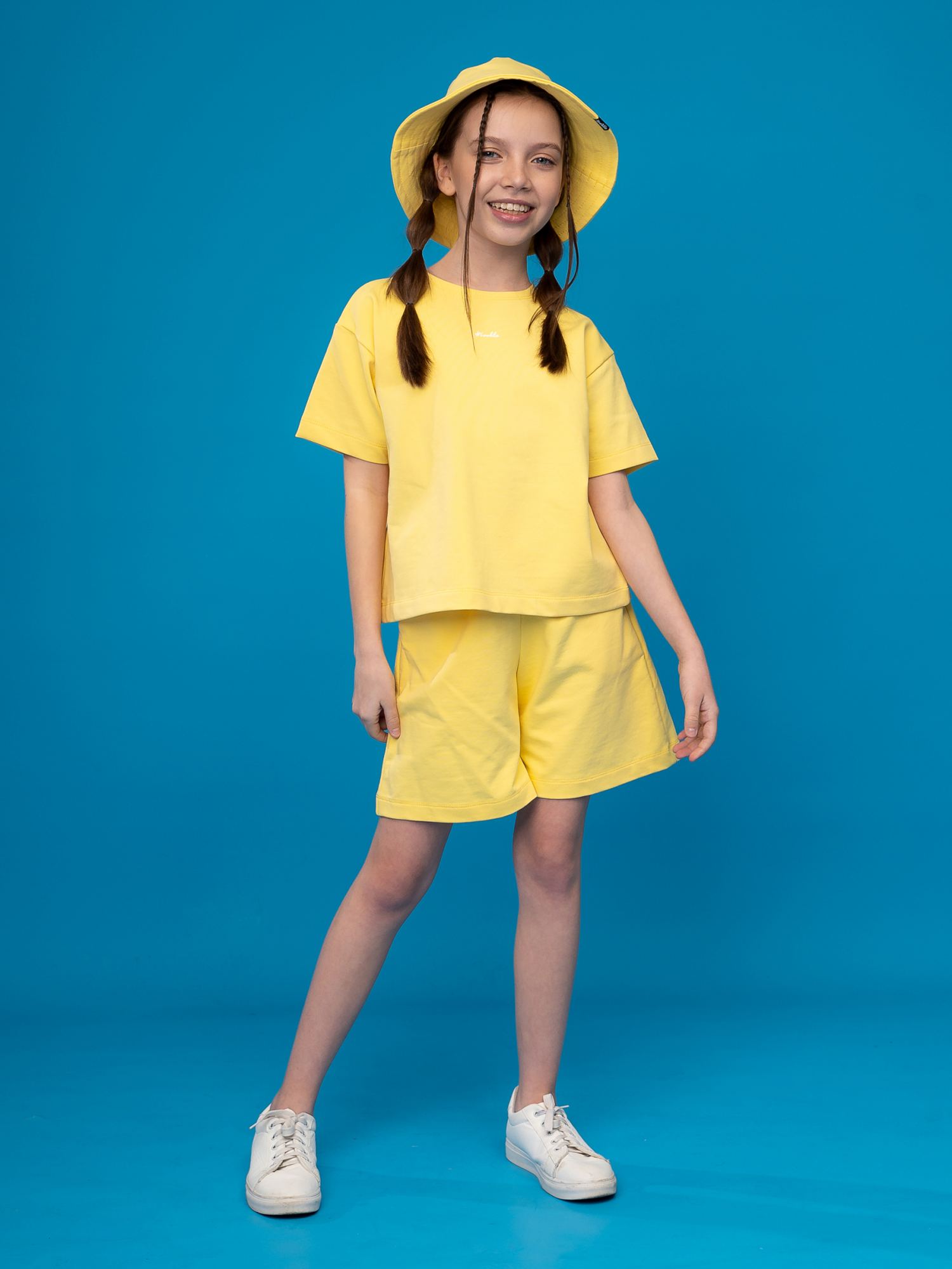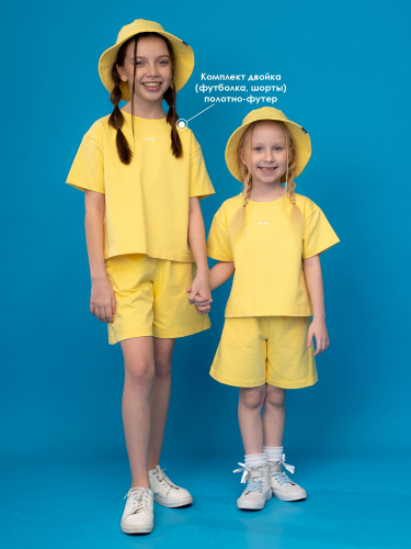 Костюм- двойка из футера лимонного цвета для девочки . Состоит из футболки и шорт. Укороченная футболка свободного силуэта со спущенной линией плеча и рукавами длиной до локтя. Удобные шорты с боковыми карманами, пояс на эластичной резинке. Изделие выполнено из трикотажа премиального качества - ПЕНЬЕ, с содержанием хлопка более 92%