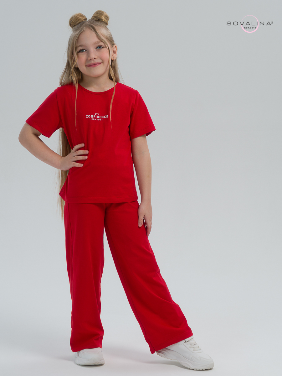 Комплект двойка TM SOVAlina для маленьких девочек, который позволит им чувствовать себя стильно и комфортно в любое время года, включая весенний и летний период. Он отлично подойдет для физкультуры, гимнастики, танцев или просто для повседневных прогулок и отдыха. В комплект входит футболка и брюки палаццо.  Широкие штаны клеш обладают свободным кроем. Хлопковая ткань и вшитая в пояс резинка создают комфорт и свободу в активностях ребенка. Эта милая футболка с расклешенными брюками и их яркий цвет придадут для девочки дополнительную индивидуальность на солнечное лето, теплую весну и отопительный сезон в помещении. Костюмчик изготовлен из высококачественного трикотажа, он хлопковый и легкий - идеальный выбор для активных игр в саду или домашняя пижама для детей. Элементы костюма можно носить как вместе, так и по отдельности.