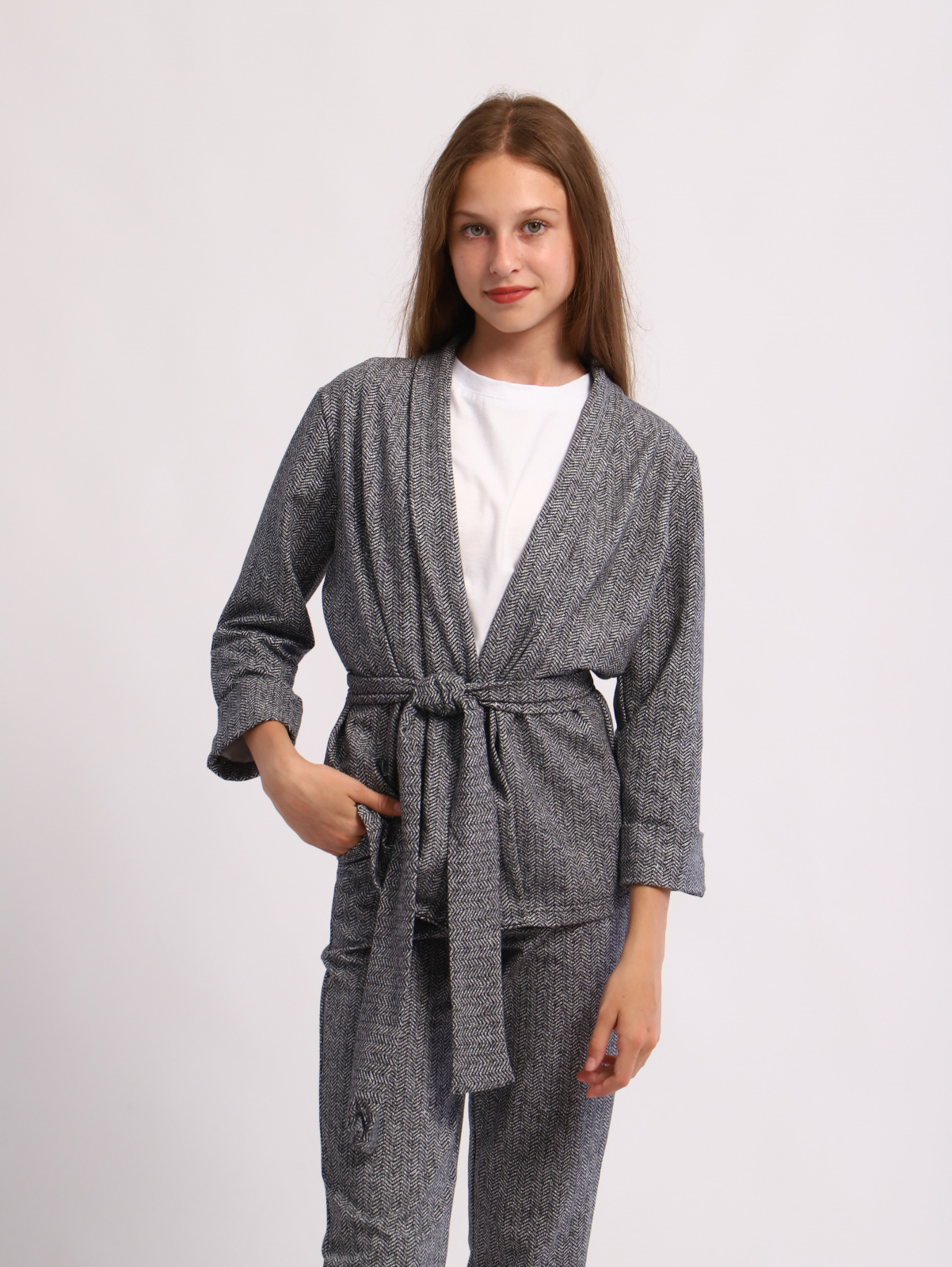 Трикотажный школьный костюм - двойка, который состоит из жакета с поясом кроя оверсайз и брюк на резинке прямого свободного кроя. Брюки с высокой и комфортной посадкой и эластичным поясом на резинке. Штаны длиной 7/8. в боковых швах - карманы. Женский пиджак прямого кроя с отворотом, длина рукава три четверти (3/4) с подгибом. Жакет фиксируется на талии элегантным поясом.
