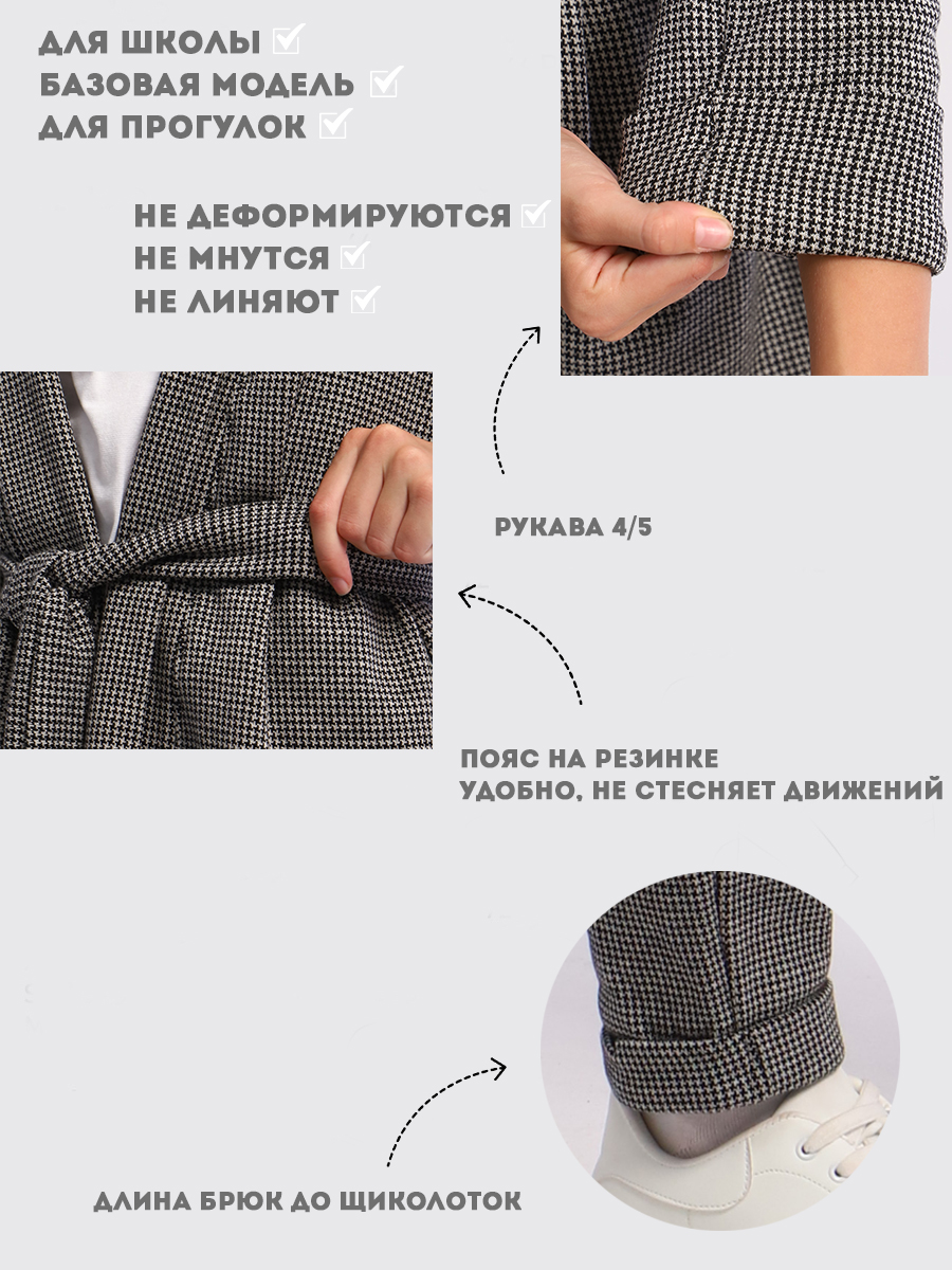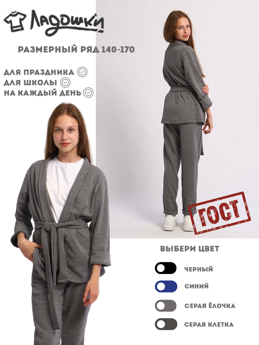 Трикотажный костюм школьный для девочки состоит из жакета с поясом кроя оверсайз и брюк на резинке прямого свободного кроя. Брюки с высокой и комфортной посадкой и эластичным поясом на резинке. Штаны длиной 7/8. в боковых швах - карманы. Пиджак школьный можно носить отдельно в повседневной жизни, комплектуя его например, с школьными шортиками или юбками. Жакет объемный с длинным рукавом, на талии фиксируется поясом. базовый универсальный комплект школьной одежды можно носить как с кроссовками или кедами, так и с классическими туфлями на высоком или низком каблуке. Нарядный костюм для торжеств сочетается и с шелковыми блузками. Школьный брючный наряд для девочки можно надеть не только на уроки но и на праздничные мероприятия. Деловой классический стиль так же востребован и повседневно. Натуральны хлопковый состав позволяет чувствовать удобство и комфорт. Базовая классическая модель костюма школьного очень идет девочкам постарше. Это прекрасный подарок к началу учебного года на 1 сентября или на 8 марта! Размерный ряд достаточно широк, до 164 роста.