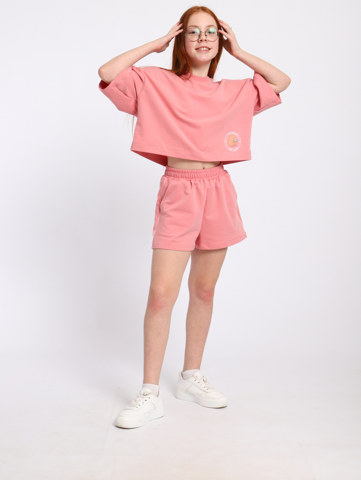 Модный монохромный комплект для девочек-подростков остается на пике женской и подростковой моды. Детский комплект сшит из хлопкового трикотажа с добавлением лайкры. Данная модель состоит из кофты с милым принтом "капибара" в нижней части изделия и короткими рукавами с спущенными плечами. Шорты высокой посадкой с белым кантом по всей длине шорт.
