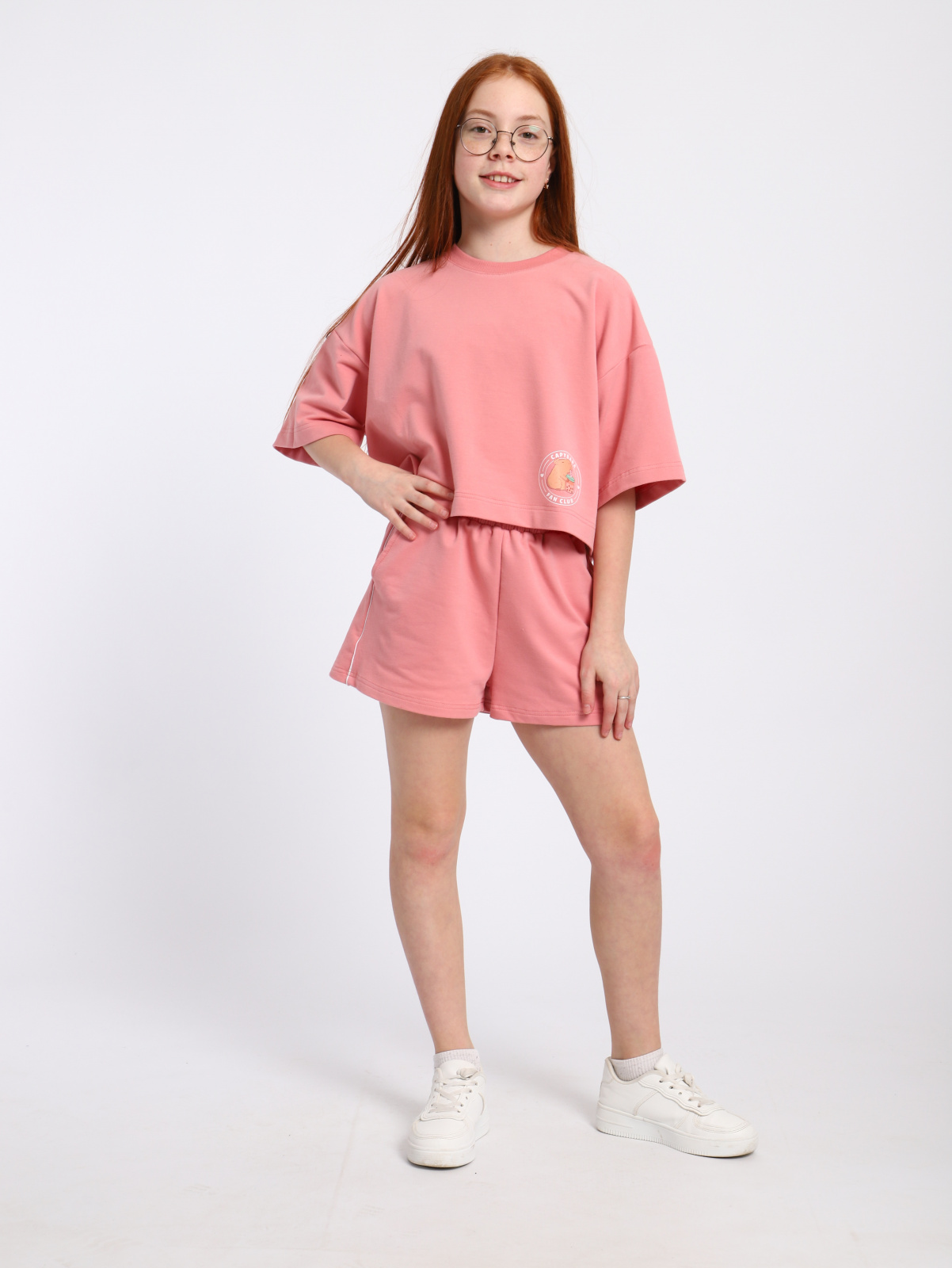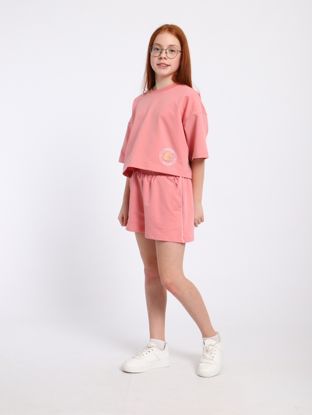 Модный монохромный комплект для девочек-подростков остается на пике женской и подростковой моды. Детский комплект сшит из хлопкового трикотажа с добавлением лайкры. Данная модель состоит из кофты с милым принтом "капибара" в нижней части изделия и короткими рукавами с спущенными плечами. Шорты высокой посадкой с белым кантом по всей длине шорт.