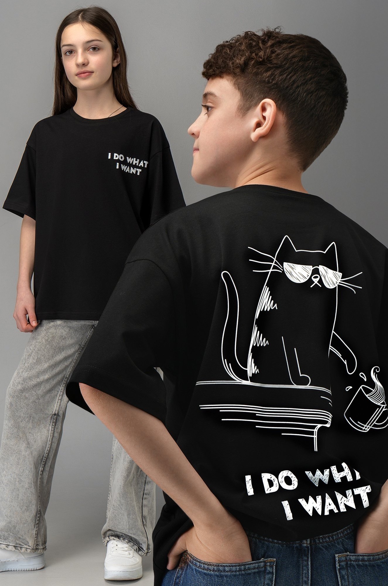 Футболка оверсайз для девочек, мальчиков и подростков выполнена из 100% хлопка. Детская футболка представлена в черном цвете и украшена прикольным рисунком на спине.