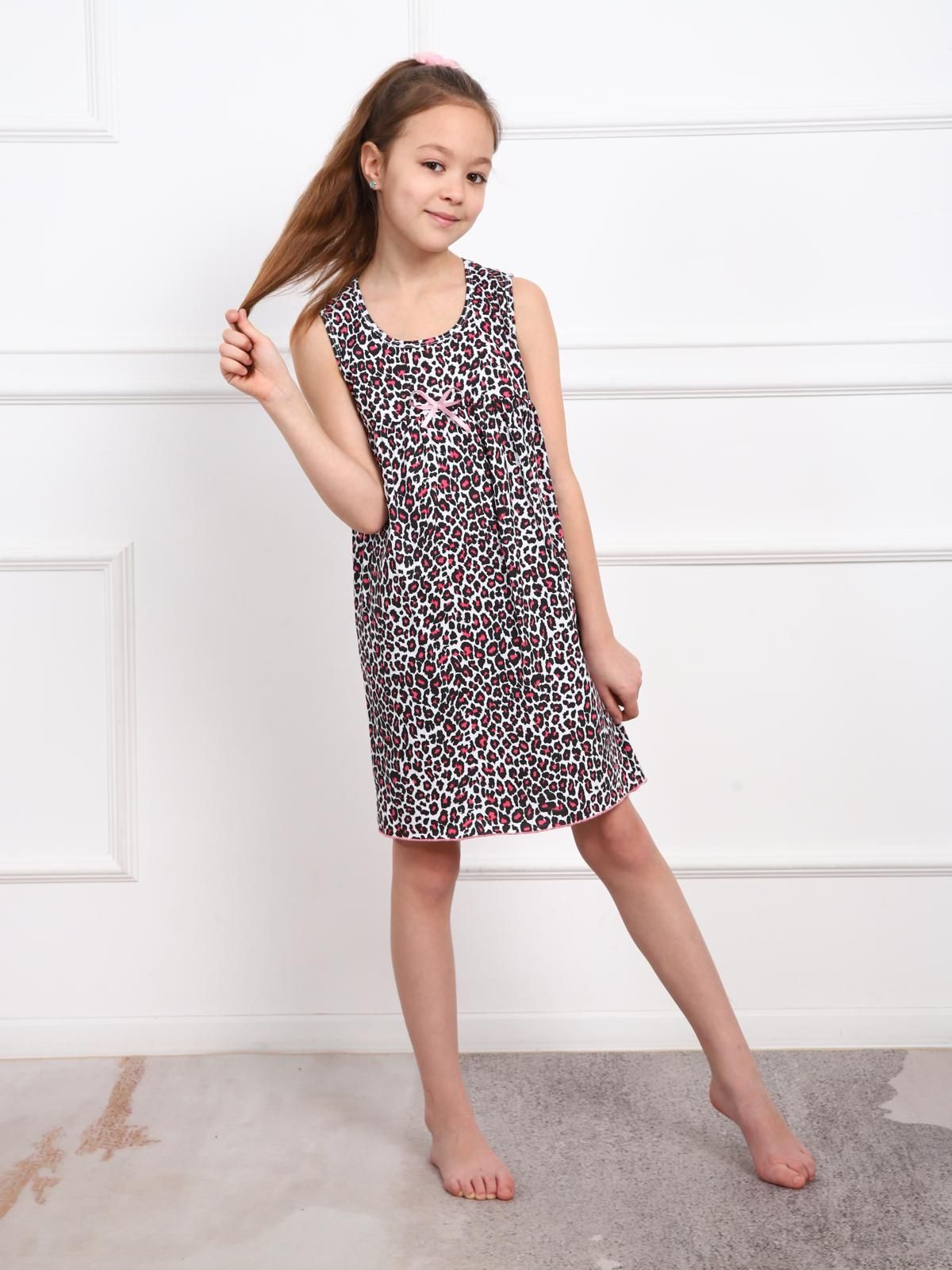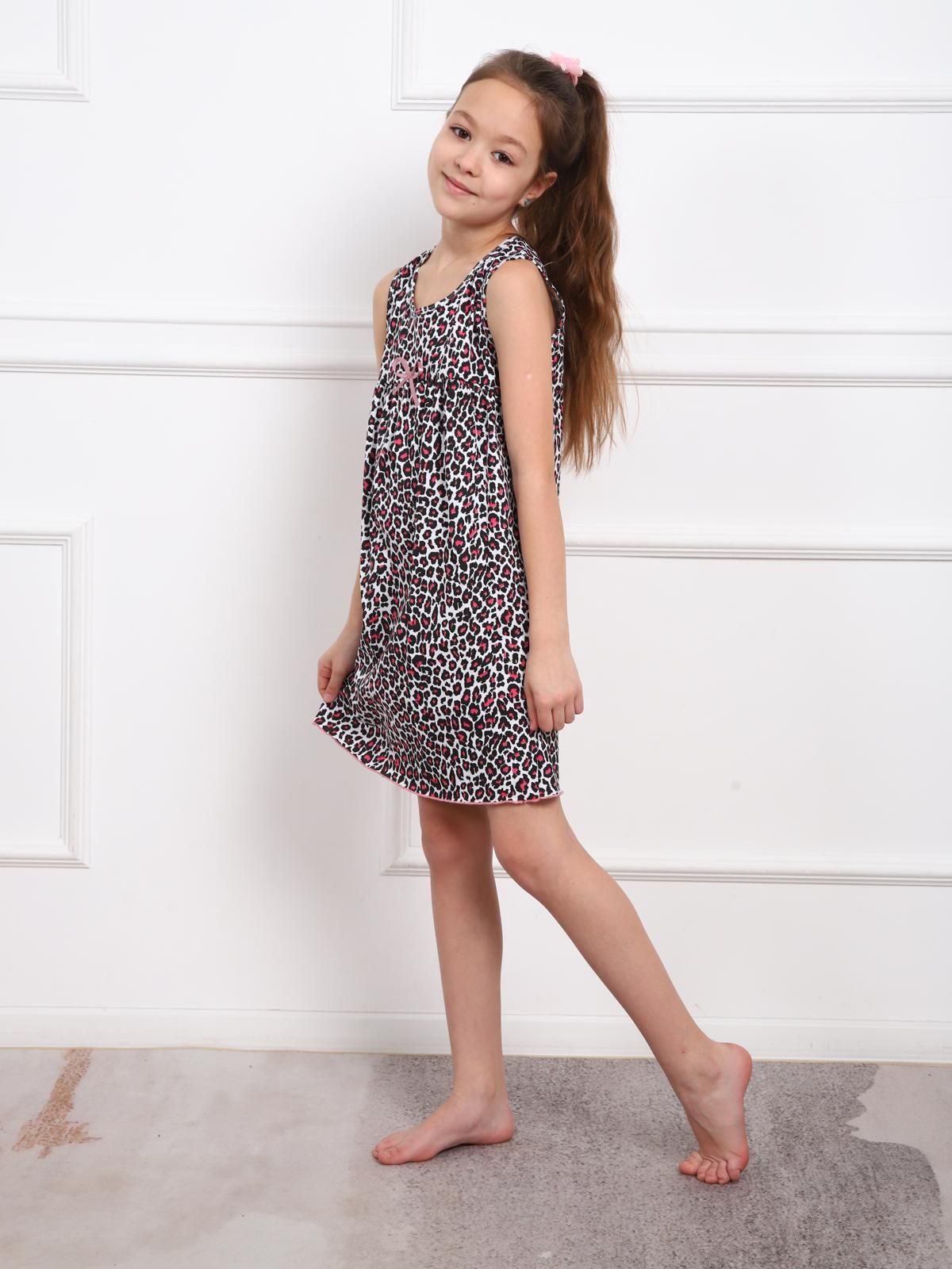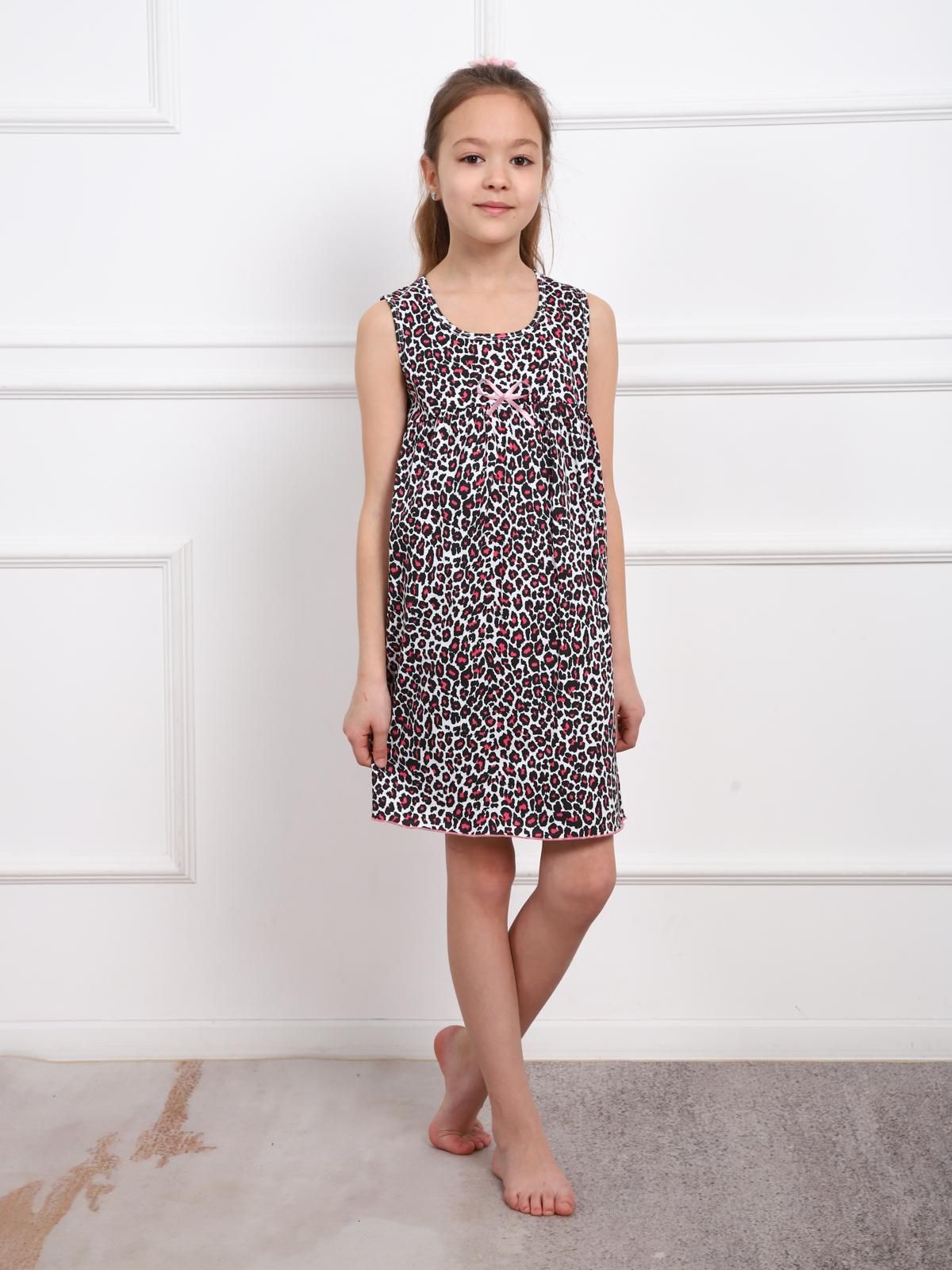 Ночная сорочка для девочки из хлопкового полотна. О-образный вырез горловины и открытые проймы в совокупности со свободным силуэтом обеспечивают свободу движениям и комфортную посадку. Полочка изделия имеет отрезную кокетку и декорирована милым атласным бантиком. Низ сорочки обработан на краевой машине. Под кокеткой сделана сборка, что придаёт силуэту изящную трапециевидную форму.