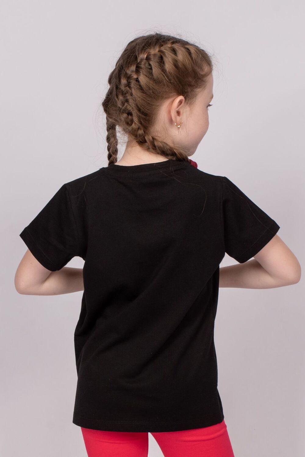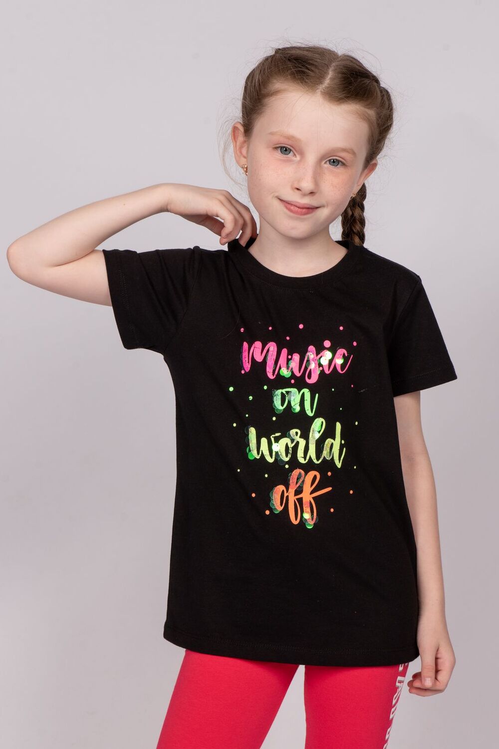 Футболка для девочки прямого силуэта, с втачным коротким рукавом. Горловина круглая, обработана воротником из рибаны. По горловине полочки отделочная строчка. Низ изделия и рукава обработан швом вподгибку. На полочке принт Шелкография с пайетками. Надпись переводится как Музыка в выключенном мире. Цвет: черный; Материал: кулирка;кулирка; Состав: 100% Хлопок.