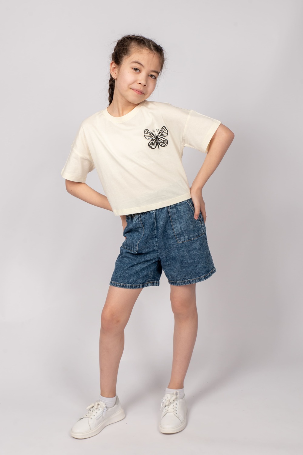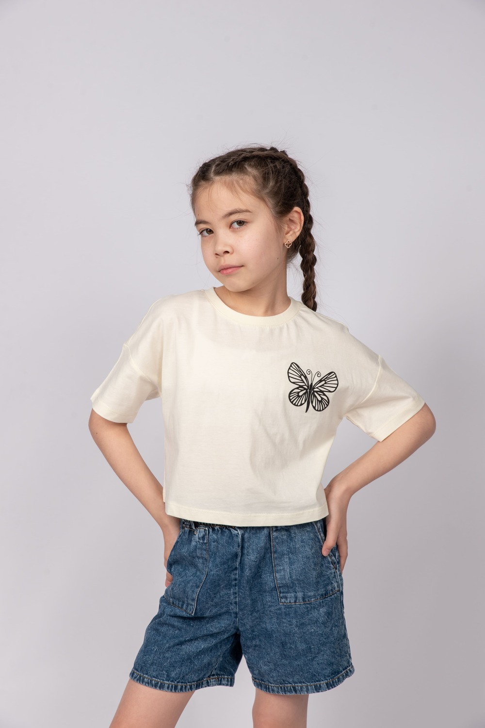 Футболка для девочки укороченная выполнена из 100% хлопка. Футболка прямого силуэта, со спущенным плечом, коротким рукавом. Благодаря эластичной горловине, выполненной из рибаны, футболку удобно снимать и надевать. На полочке принт Шелкография со вспенкой. Материал не растягивается и не деформируется. Цвет: нежно-голубой; Материал: кулирка;кулирка; Состав: 100% Хлопок.