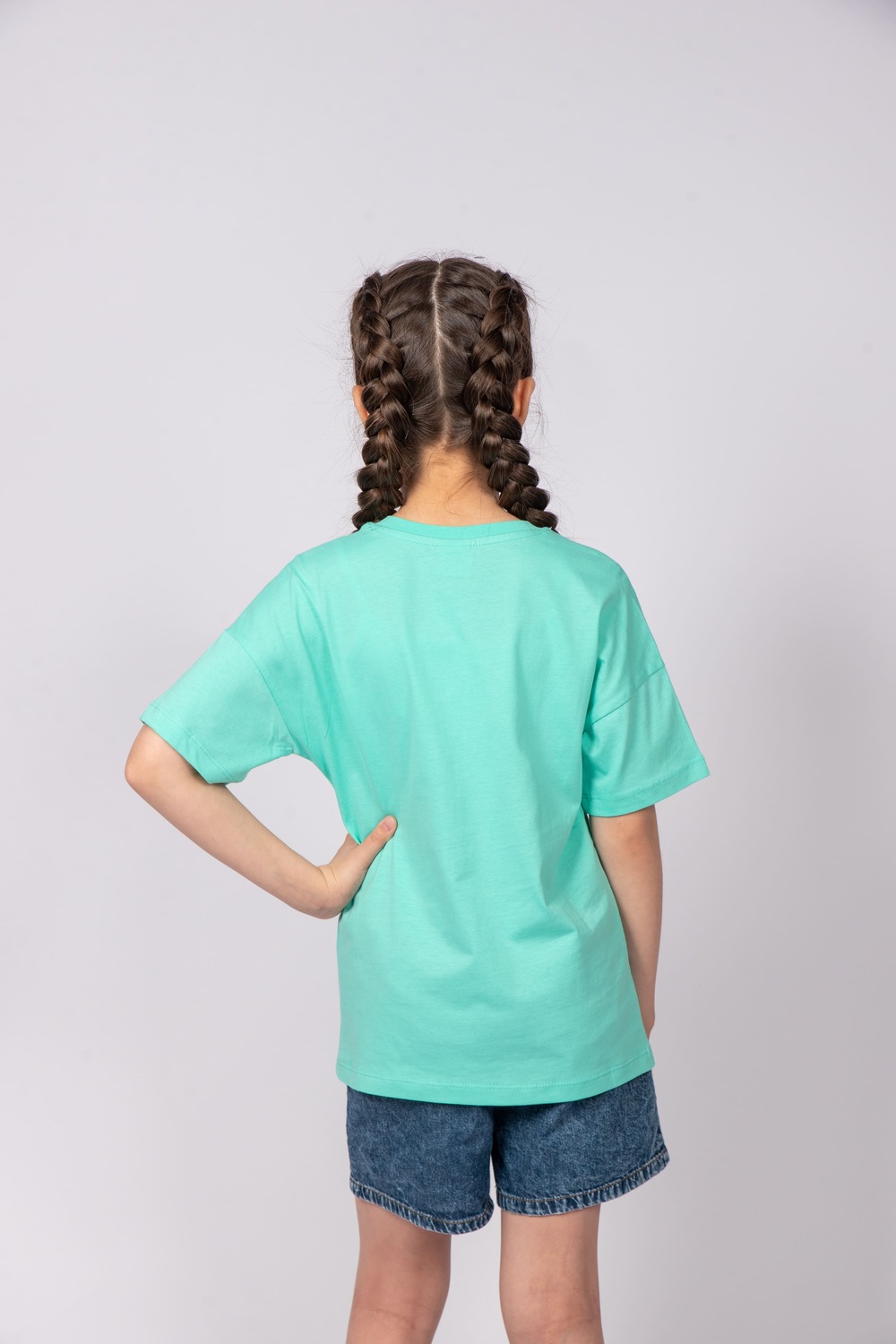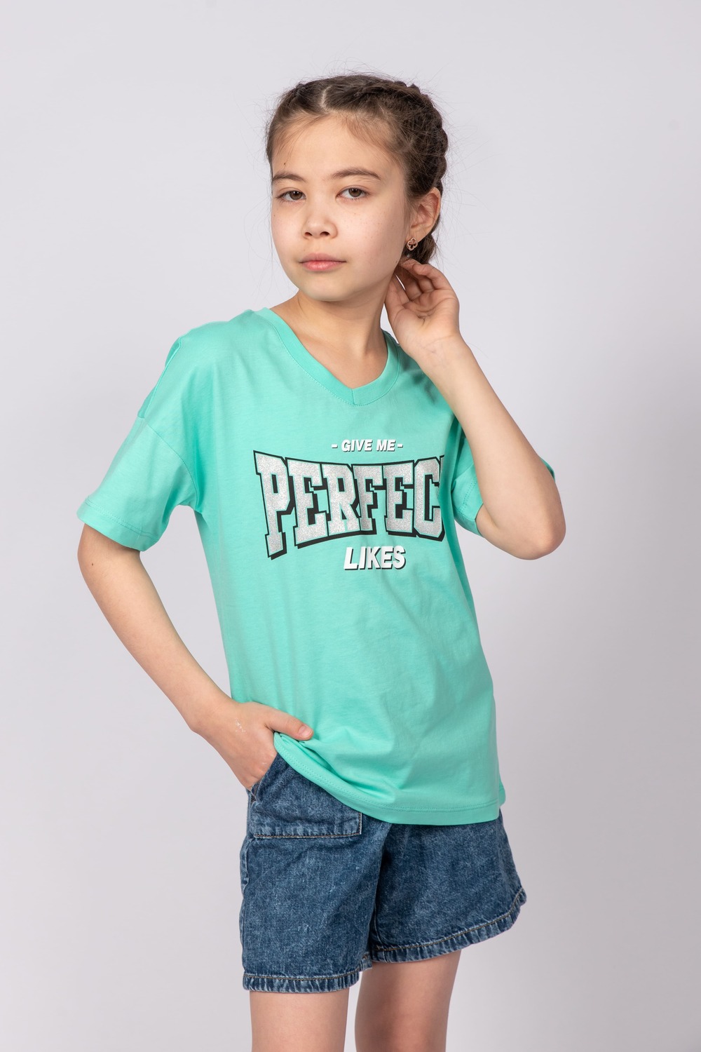 Футболка для девочки выполнена из 100% хлопка. Футболка прямого силуэта, со спущенным плечом, коротким рукавом. Горловина имеет V-вырез. На спинке принт Шелкография с глиттером. Надпись переводится как Поставь мне идеальные лайки. Материал не растягивается и не деформируется. Цвет: ментол;темно-синий; Материал: кулирка;кулирка; Состав: 100% Хлопок.