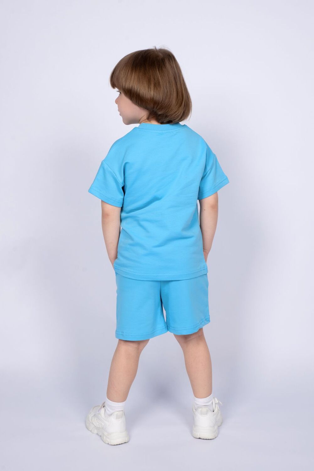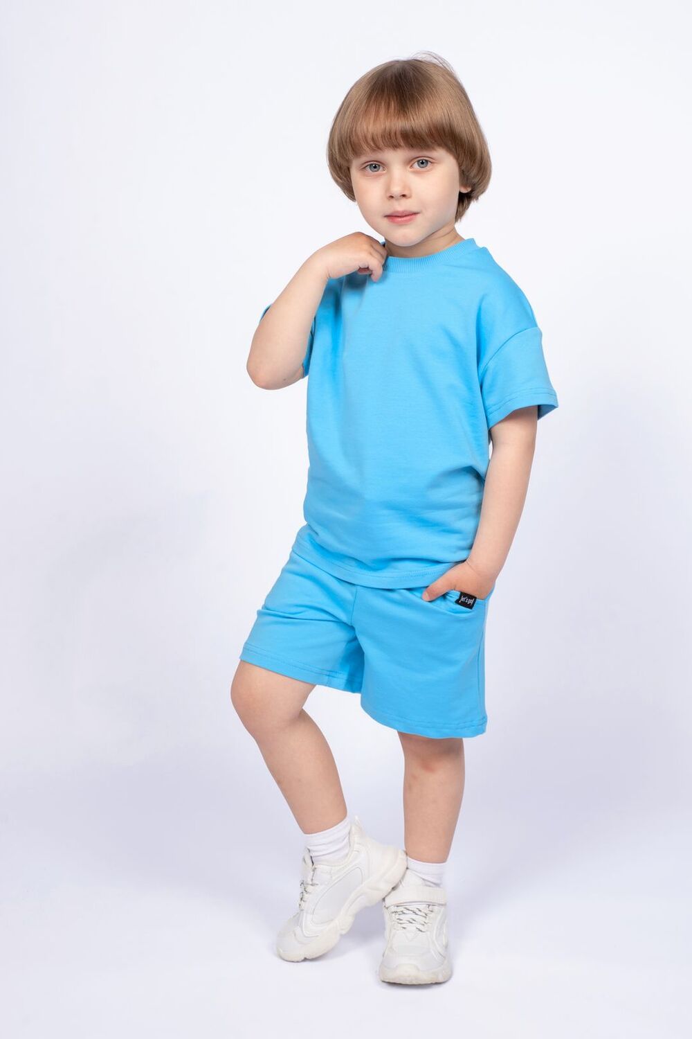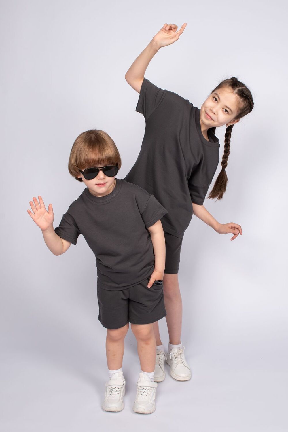 Комплект детский, состоящий из футболки и шорт. Футболка оверсайз с фигурным низом и спущенным рукавом. Горловина круглая, обработана воротником из кашкорсе. Горловина спинки внутри укреплена бейкой из кулирки. Низ изделия и рукава обработан швом вподгибку. Шорты прямого силуэта. Отрезной пояс, в цвет изделия, из основного полотна с эластичной тесьмой внутри. По поясу шорт вставлен плоский утягивающий шнурок. Длина шнурка = длина пояса + 45 см для возможности завязывания. На передней половинке шорт карманы с отрезным бочком. Низ изделия обработан швом в подгибку. Цвет: черный; Материал: футер 2-х нитка;футер 2-х нитка; Состав: 95% хлопок 5% эластан.