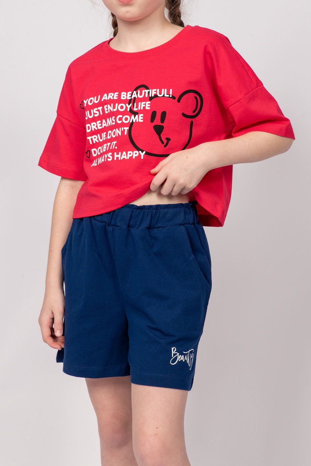 Модные и удобные трикотажные шортики - отличный выбор для девочек на летний сезон и для занятий спортом. В пояс вставлена эластична тесьма. На левой передней половинке шорт принт шелкография. Надпись переводится как Красота. Цвет: салатовый;темно-синий; Материал: кулирка;кулирка; Состав: 100% Хлопок.