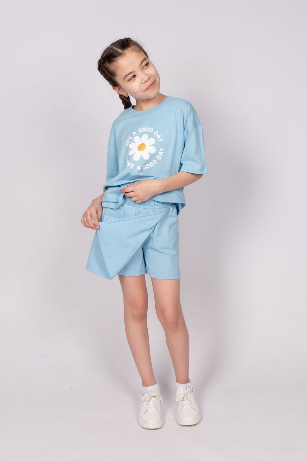 Шорты для девочки прямого силуэта из кулирки с накладным карманом. Пояс отрезной в цвет изделия, выполнен из основного полотна, с эластичной тесьмой внутри. В передней части изделия расположена отлётная часть имитация запаха, из основного полотна. На отлетной части запаха выполнен накладной карман с клапаном из основного материала. На клапане принт шелкография с глиттером. Надпись переводится как Вперед. Низ изделия и отлетная часть запаха обработан швом в подгибку.