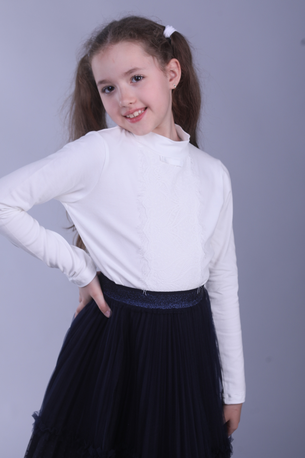 Джемпер с воротником-стойкой декорирован кружевом в цвет изделия по центру полочки. Атласный бант в цвет изделия добавляет элегантности. Низ изделия и рукава обработан швом вподгибку. Цвет: кремовый; Материал: кулирка;кулирка; Состав: 95% Хлопок, 5% Эластан.