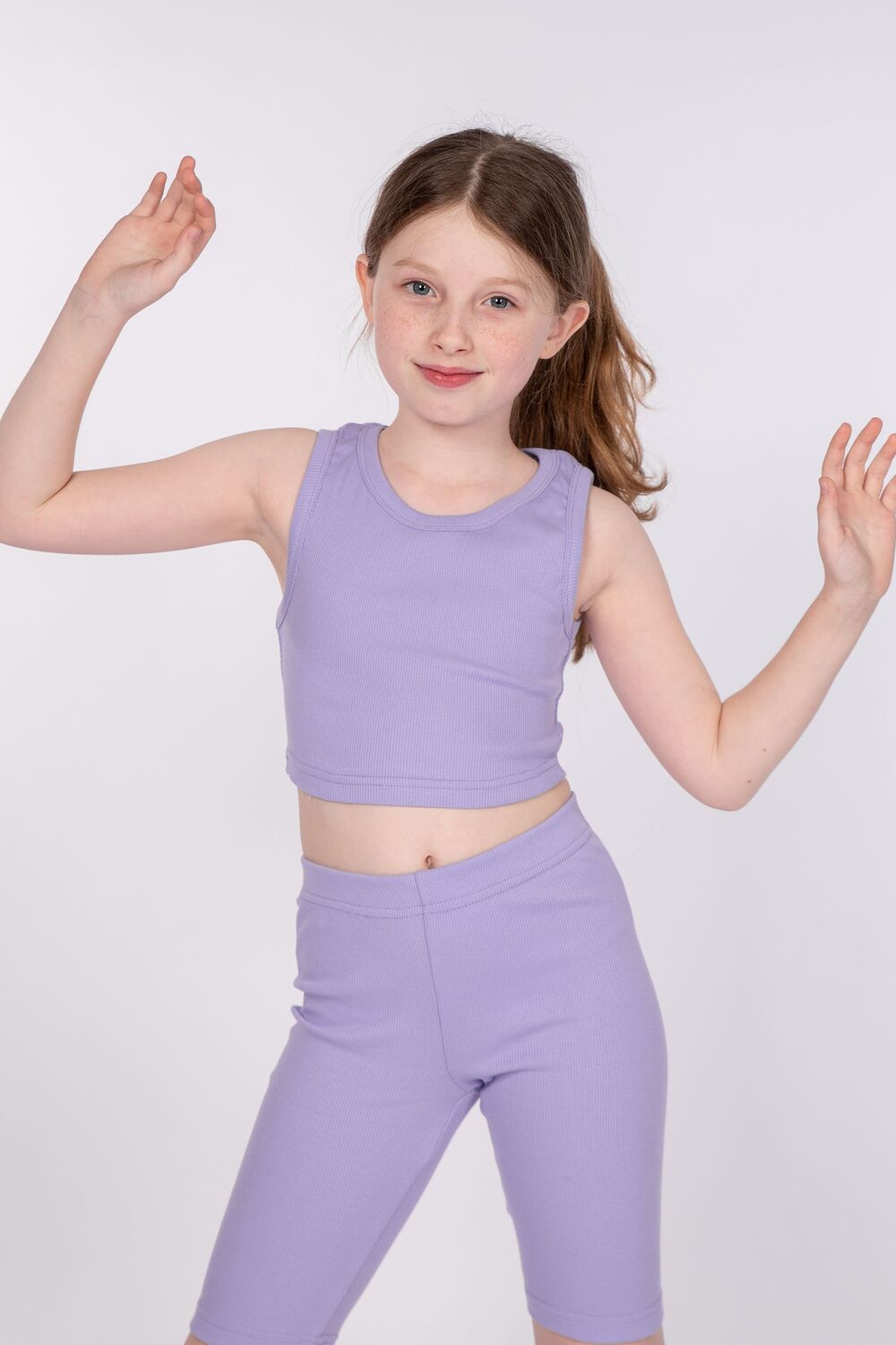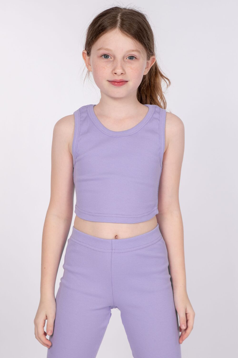 Топ для девочки приталенного силуэта из гладкокрашенного полотна. Линия горловины и проймы круглые, обработана бейкой из кашкорсе. Низ изделия обработан швом вподгибку. Цвет: лавандовый;синий; Материал: кашкорсе;кашкорсе; Состав: 92% хлопок 8% эластан.
