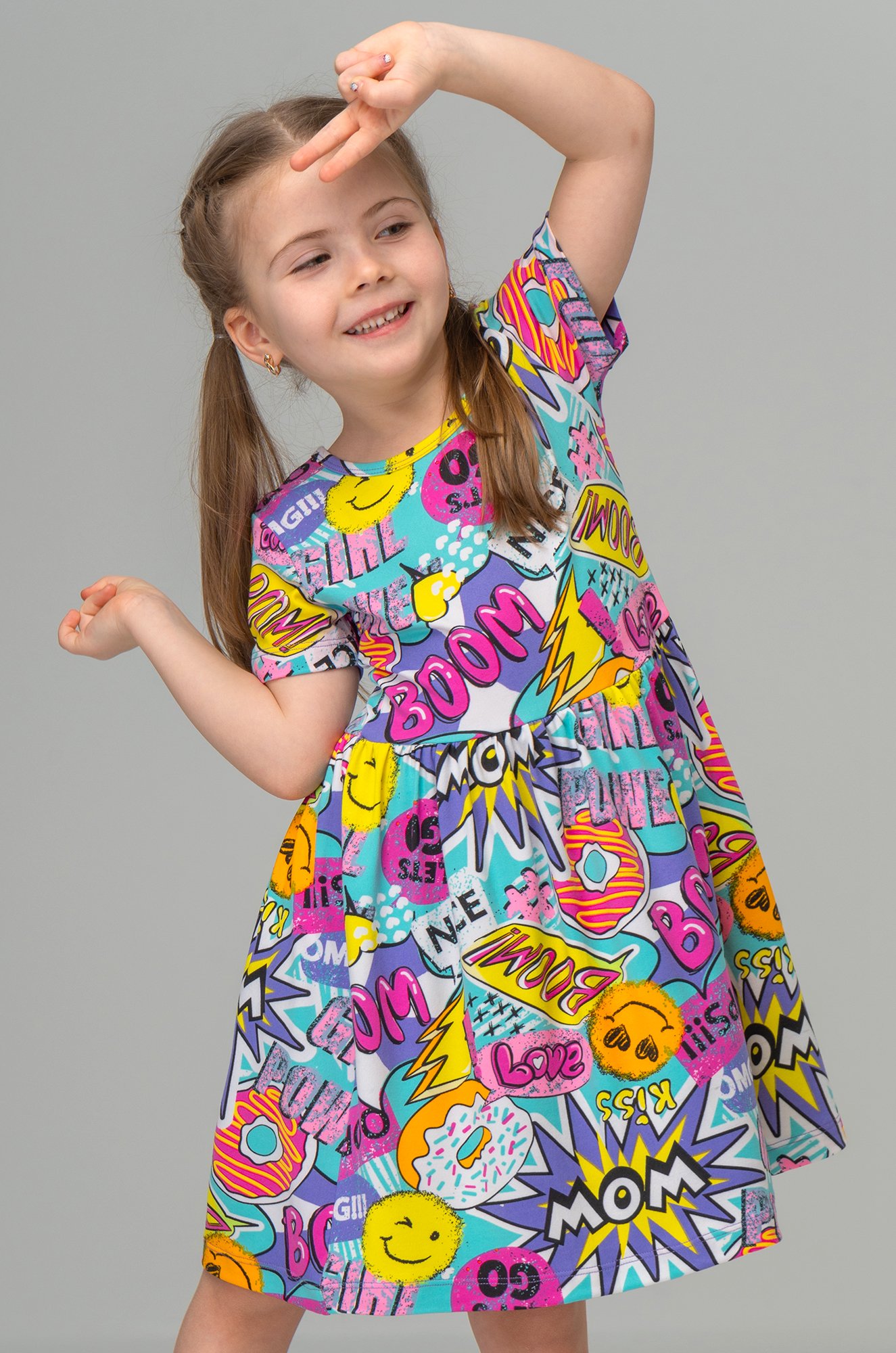 Полуприталенный свободный крой не стесняет движения активных деток. Красивый набивной рисунок не оставит равнодушной ни одну малышку.