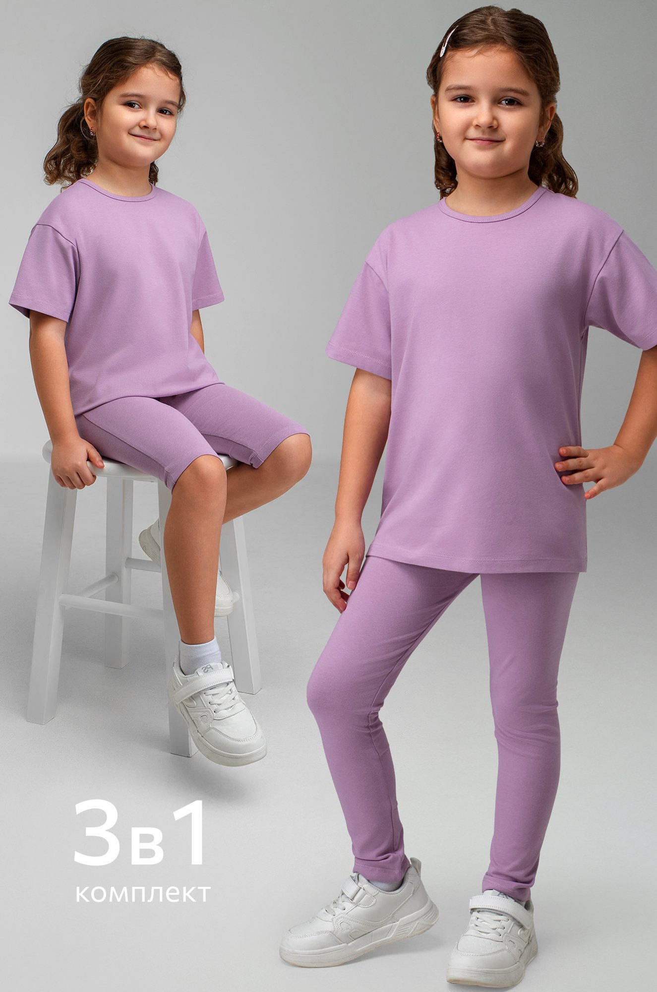 Футболка с короткими рукавами и спущенным плечом выполнена в стильном оверсайз-формате. Велосипедки отлично подходят для разнообразных активностей. Лосины подойдут для прохладных летних вечеров. Детский костюм с легинсами создан для занятий спортом.