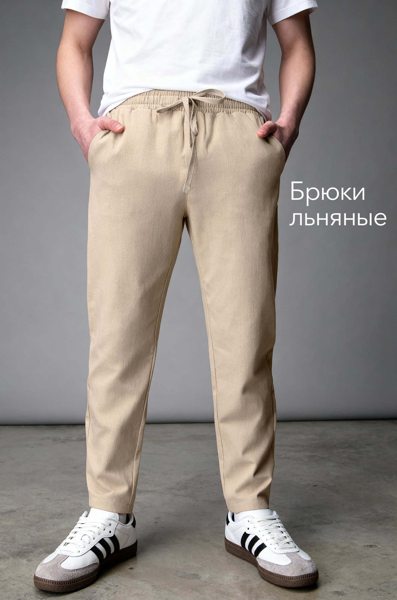 Льняные штаны имеют свободный крой и слегка заужены книзу, что делает их стильными и удобными. Пояс на резинке с регулируемым шнурком дает идеальную посадку и простоту в надевании. Внутренние карманы по бокам добавляют функциональности и позволяют хранить необходимые мелочи.