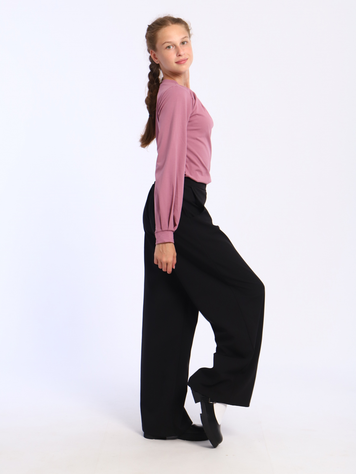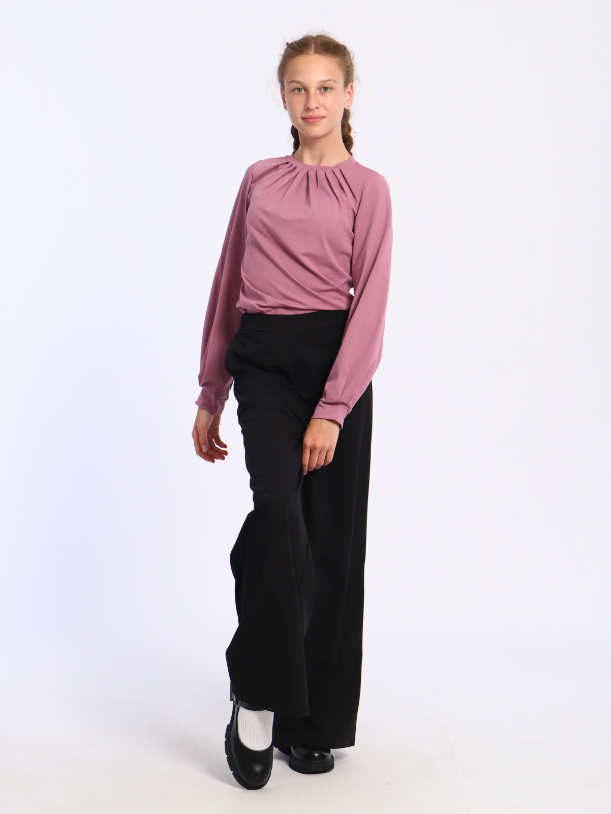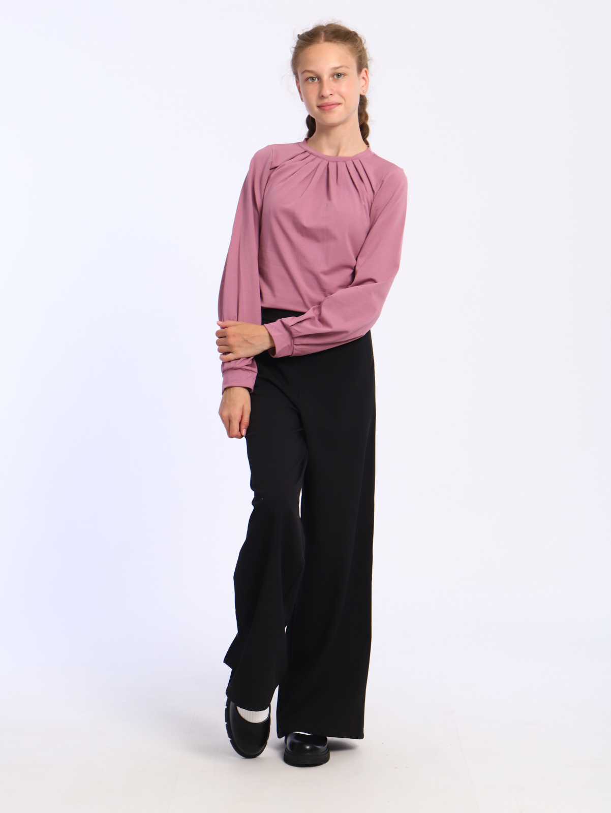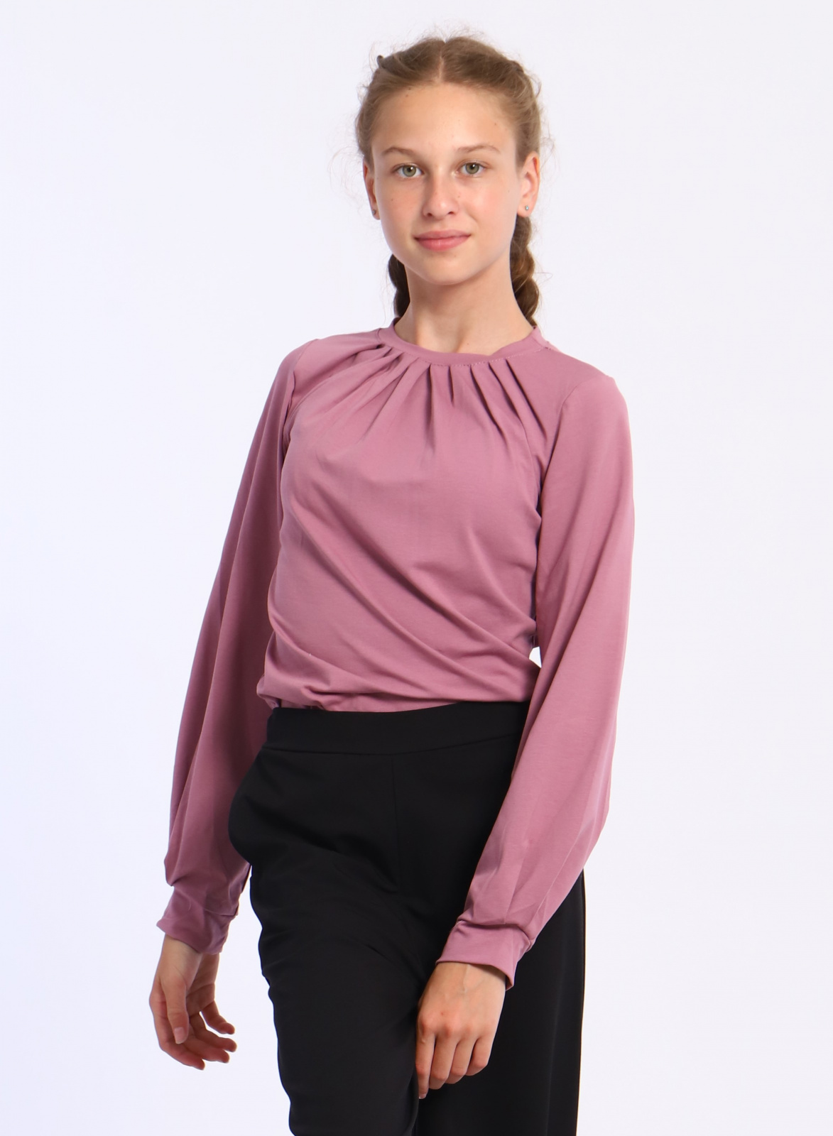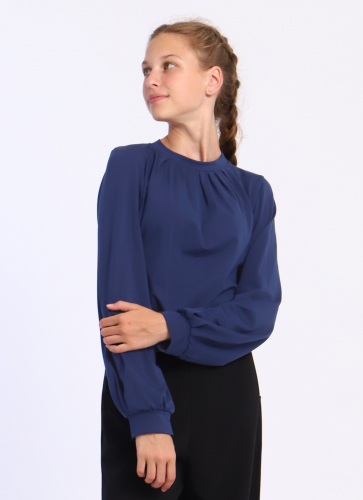 Подростковая блузка прямого кроя, с круглым воротником с защипами, длинным рукавом на манжете.
