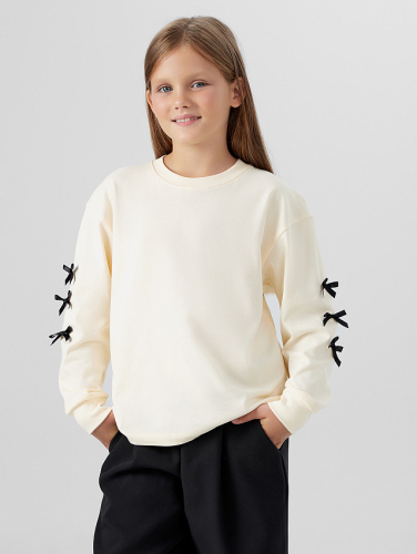 Украшением модели служит декоративный вырез на передней части, дополненный нашитыми бантиками, которые добавляют образу нежности и милого шарма. Длинные рукава и низ изделия обработаны мягким швом, который не раздражает кожу и обеспечивает аккуратную посадку.