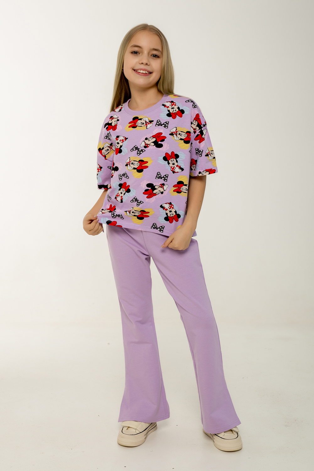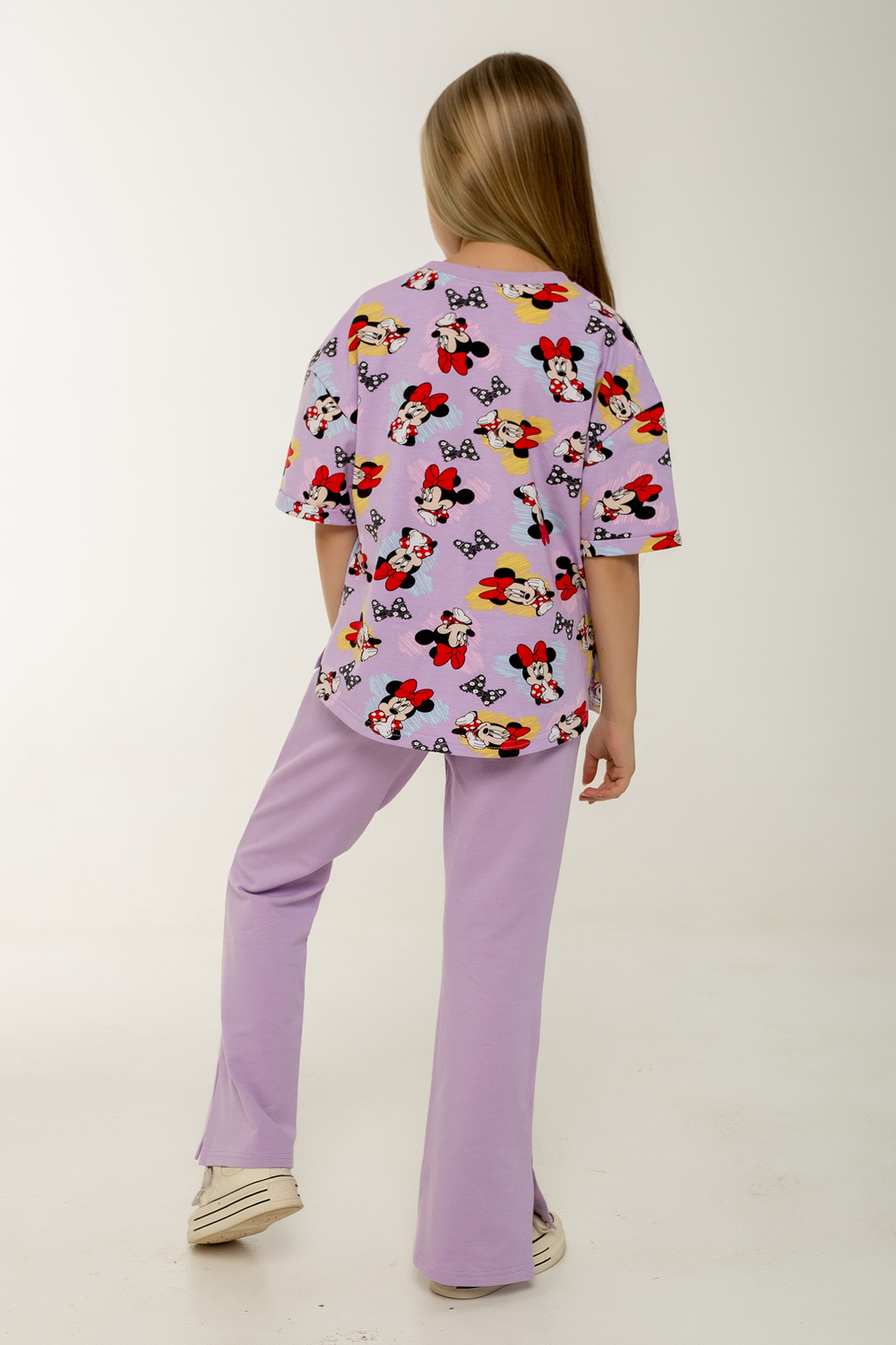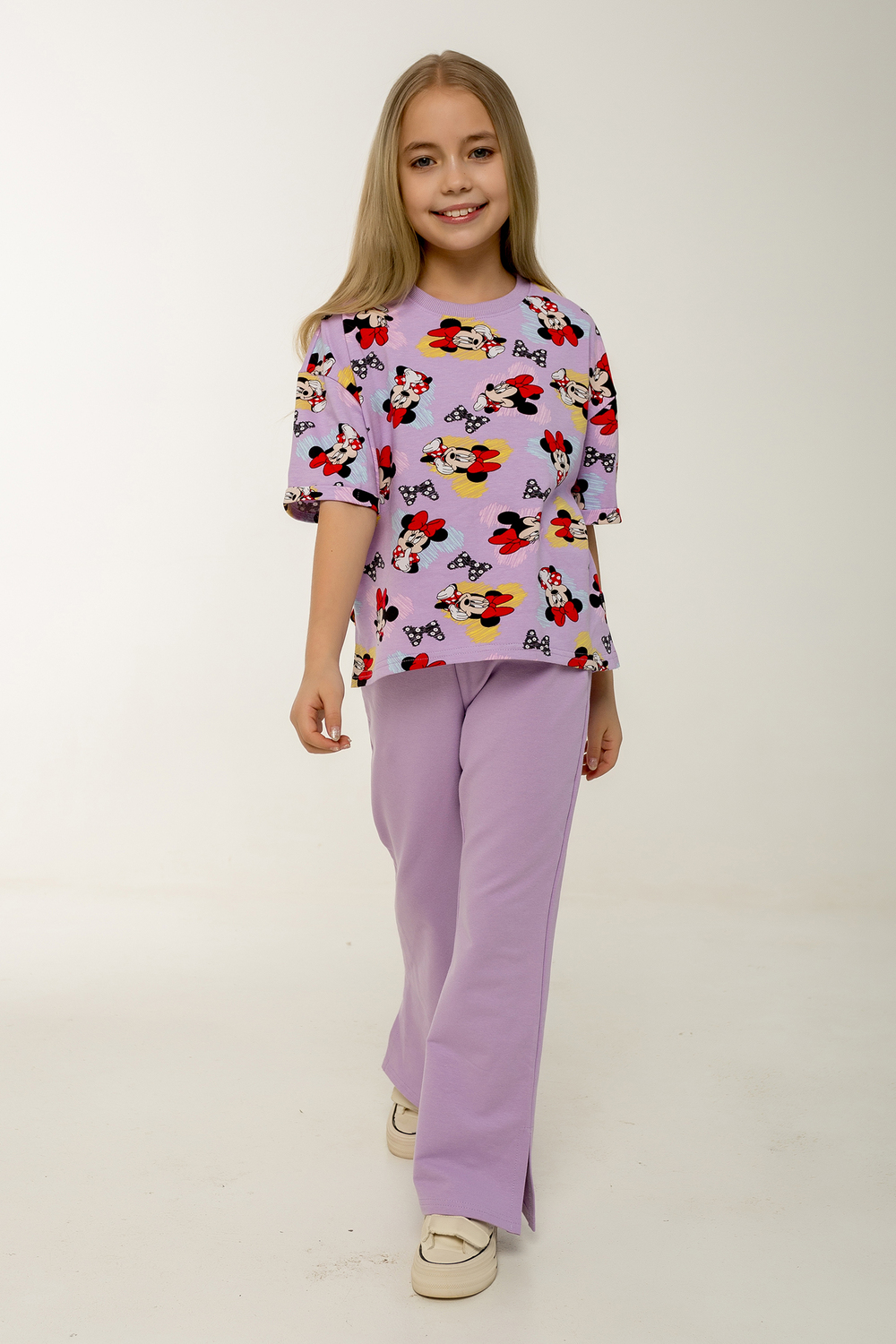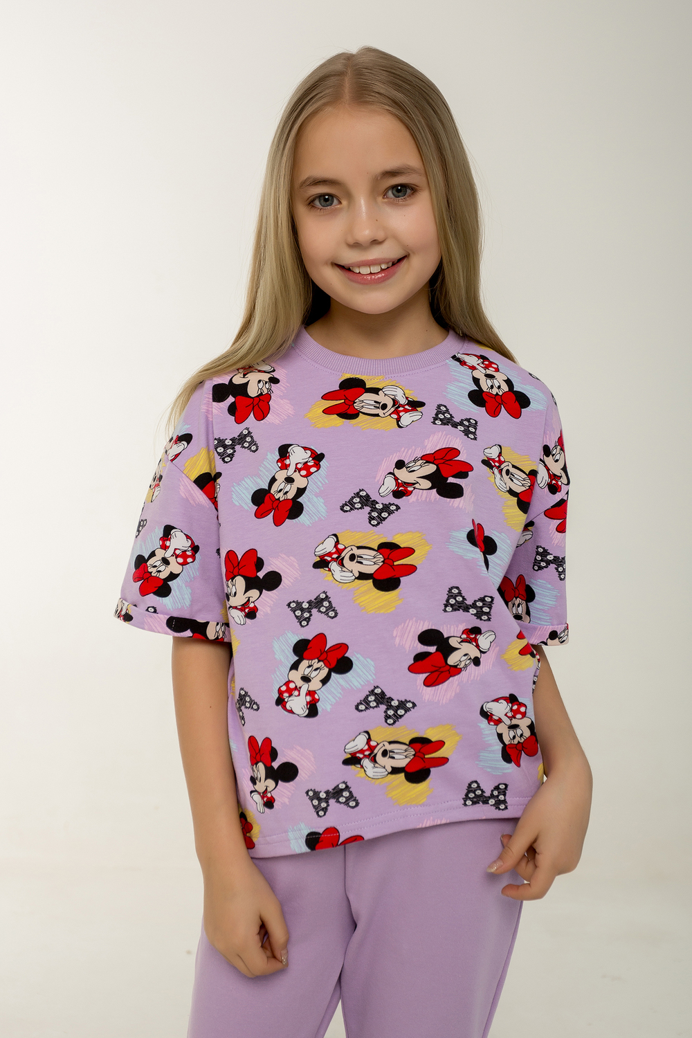 Этот стильный и удобный костюм-двойка станет замечательным выбором для активной малышки! В комплекте идет футболка с коротким рукавом и брюки, оба изделия выполнены из петельчатого футера, который обеспечивает комфорт и свободу движений. Футболка украшена модным рисунком с изображением Минни Маус, имеет короткие рукава и боковые разрезы, что добавляет оригинальности и удобства. Брюки выполнены в однотонном исполнении, без карманов, с боковыми разрезами внизу, что делает их идеальными для активных игр. Костюм прекрасно подходит для повседневного ношения, посещения детского сада или использования в качестве домашнего комплекта. Продукция сертифицирована и произведена на фабрике Мариша, что гарантирует высокое качество и безопасность материалов. Цвет: сиреневый; Материал: кулирка с лайкрой;петельчатый футер;кулирка с лайкрой;петельчатый футер; Состав: Верх: 90% хл, 10% лайкра, Низ: 95% хл, 5% лайкра.