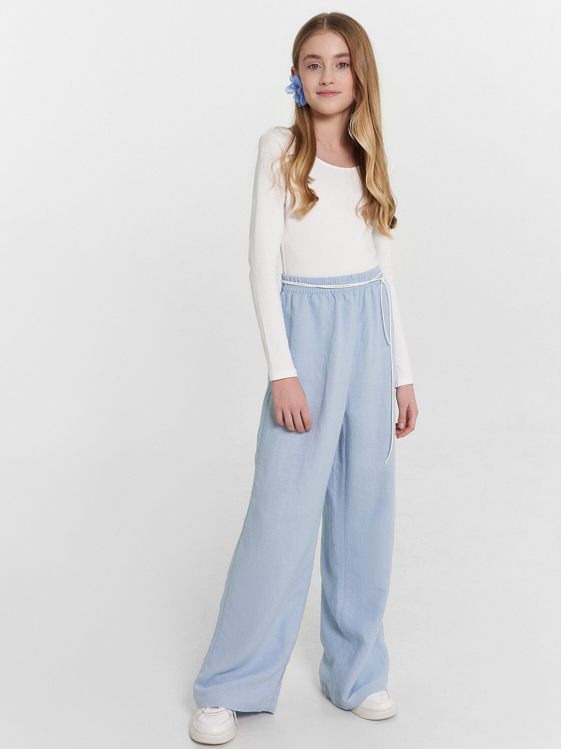 Брюки для девочек широкие. Посадка высокая. Пояс цельнокроеный из основного полотна, застрочен с эластичной тесьмой RV40 внутри, по поясу проложены отделочные строчки. В боковых швах обработаны карманы. Низ брюк обработан швом в подгибку.
