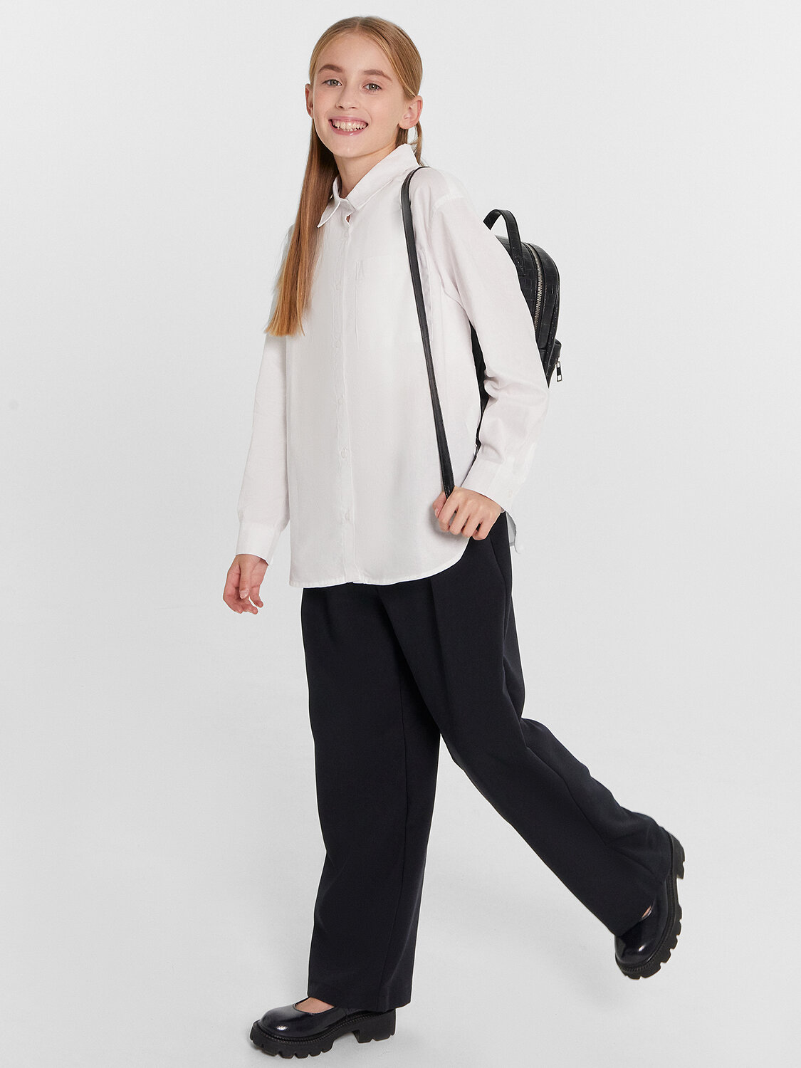 Брюки прямого силуэта. Посадка на талии. Пояс отрезной по переду гладкий, задняя деталь пояса с резиной внутри. По переду изделия складки и карманы с отрезным бочком. Низ изделия обработан швом в подгибку.