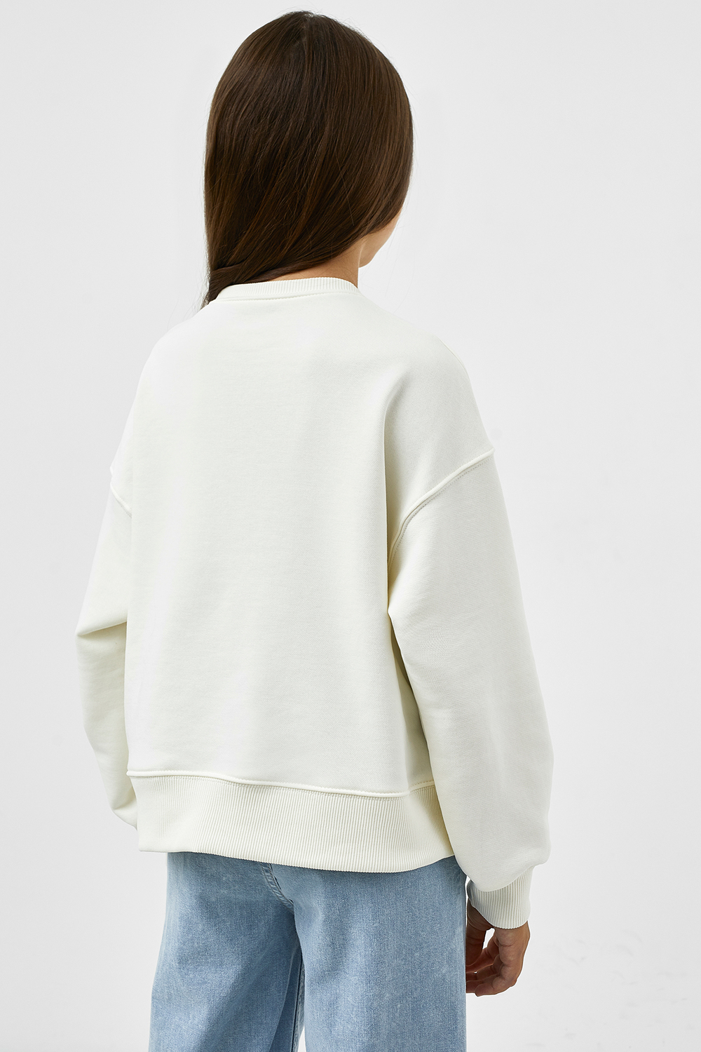 Очаровательный джемпер прямого силуэта для девочек. Выполнен из легкого трикотажного футера. Вырез круглый, классический, не глубокий. Рукава длинные, с широкими манжетами. Спущенная линия плеча дарит особый комфорт. Стильно! Цвет: молочный; Материал: футер 2-х нитка;футер 2-х нитка; Состав: 83% хлопок, 17% ПЭ.