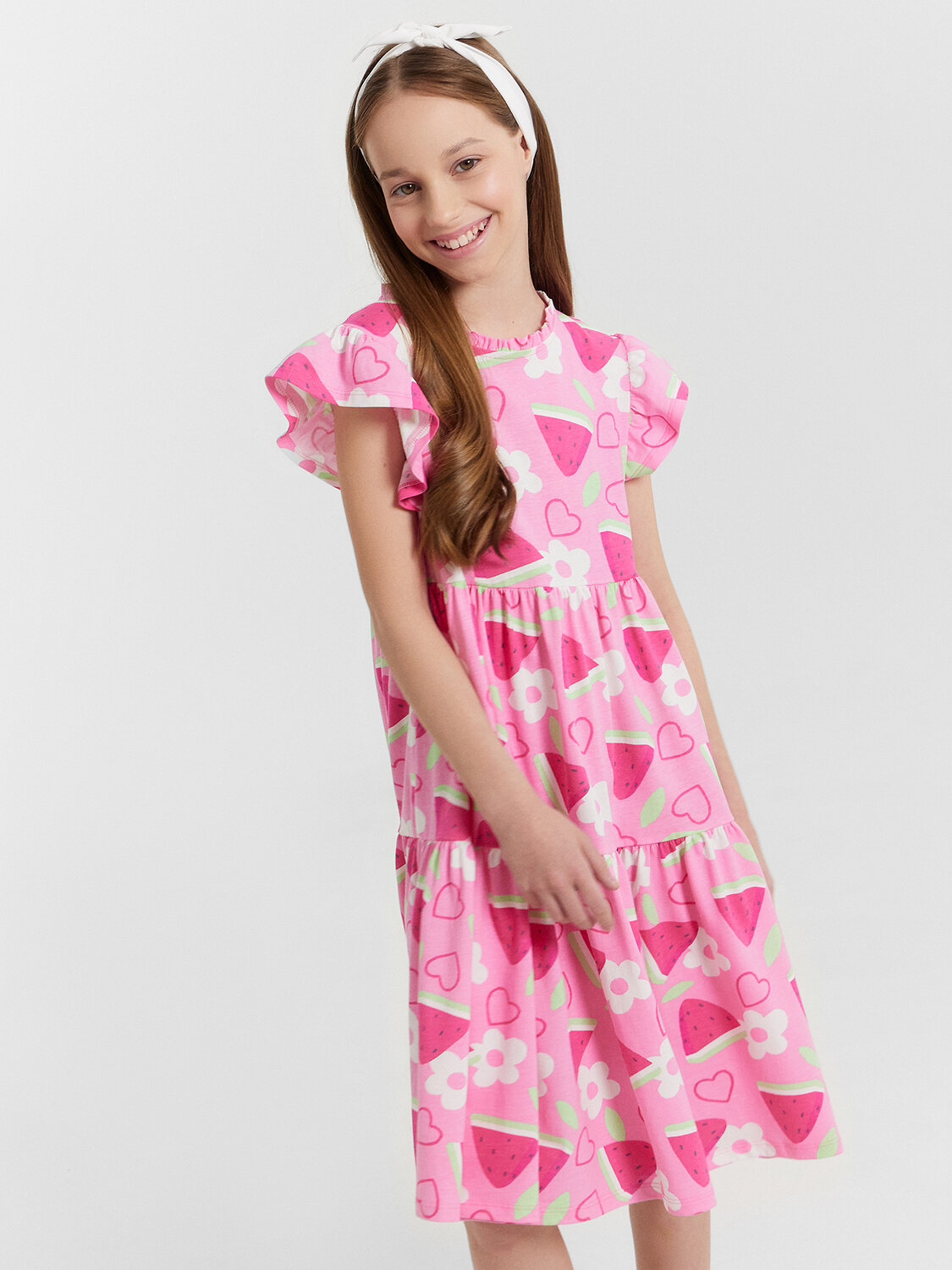 Платье А-силуэта. Короткие рукава-крылышки. В круглую горловину втачана декоративная рюша. По спинке застежка на пуговицу. Платье с двумя отрезными воланами по переду и спинке. Низ изделия обработан швом в подгибку на 2-х игольной плоскошовной машине.