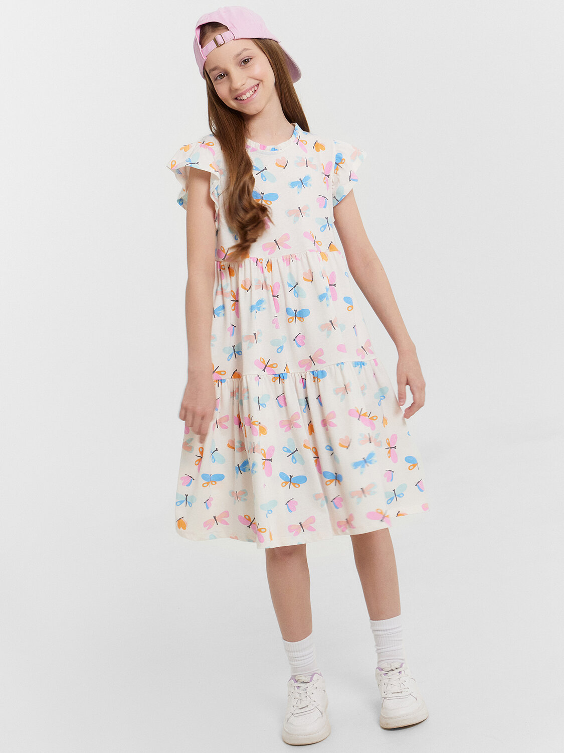 Платье А-силуэта. Короткие рукава-крылышки. В круглую горловину втачана декоративная рюша. По спинке застежка на пуговицу. Платье с двумя отрезными воланами по переду и спинке. Низ изделия обработан швом в подгибку на 2-х игольной плоскошовной машине.