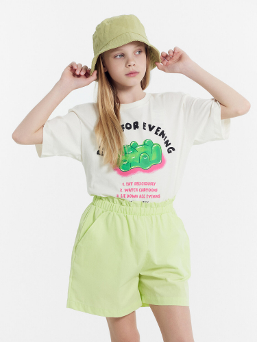 Свободные шорты для девочек, выполненные из трикотажного футера. Пояс с эластичной тесьмой внутри и регулировочным шнурком-завязкой. Рекомендуем!