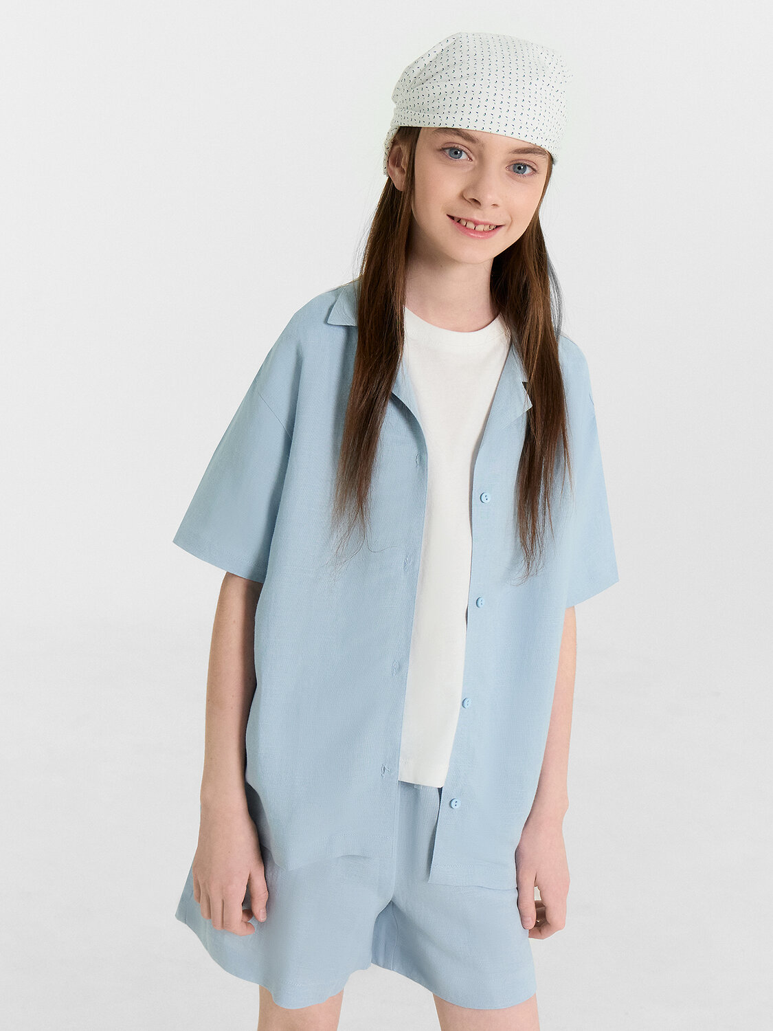 Шорты для девочек свободного силуэта из ткани. Посадка высокая. На детали переда карманы с отрезным бочком. Пояс отрезной с эластичной тесьмой RV40 внутри, на поясе пробиты петли и вставлен шнур из основного полотна. Шов втачивания пояса распошит. Длина выше колена. Низ обработан швом вподгибку с закрытым краем.