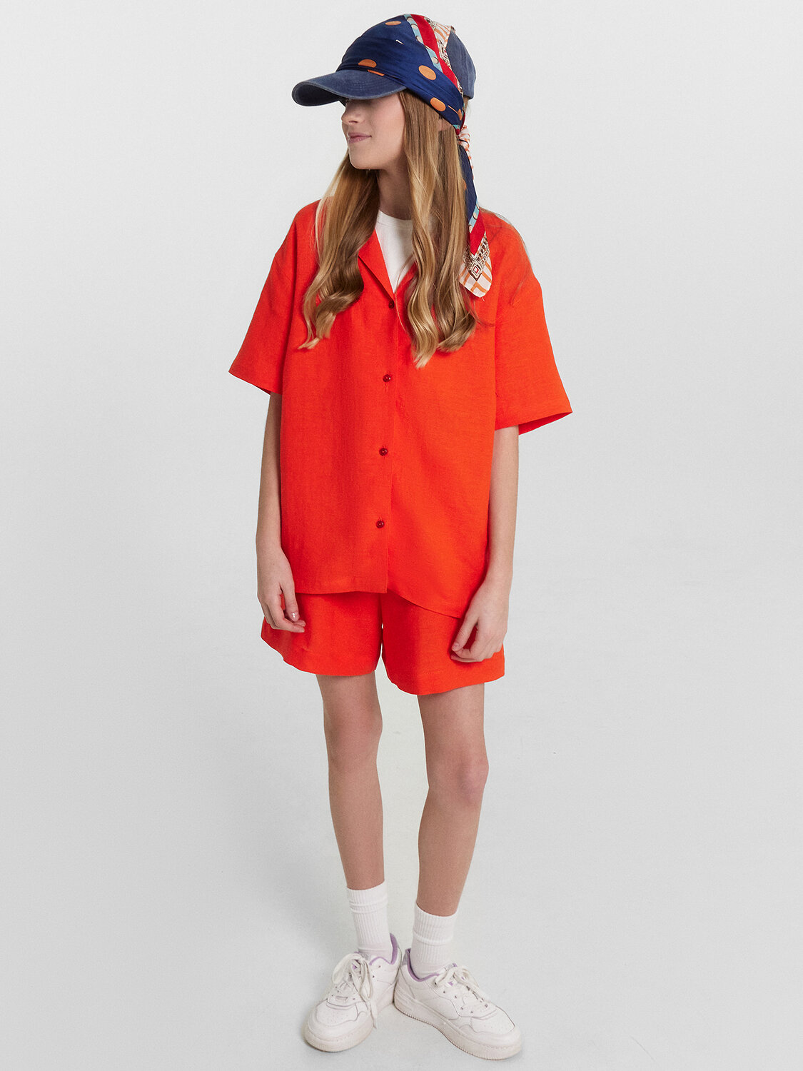 Шорты для девочек свободного силуэта из ткани. Посадка высокая. На детали переда карманы с отрезным бочком. Пояс отрезной с эластичной тесьмой RV40 внутри, на поясе пробиты петли и вставлен шнур из основного полотна. Шов втачивания пояса распошит. Длина выше колена. Низ обработан швом вподгибку с закрытым краем.