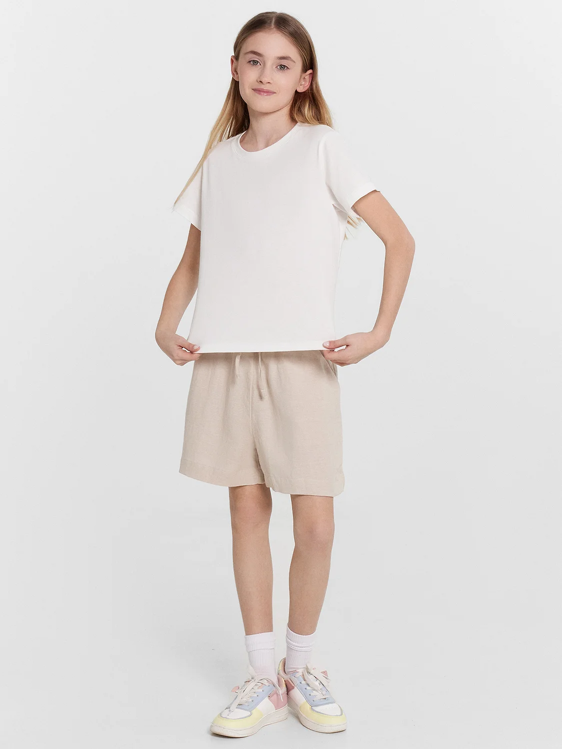 Шорты для девочек свободного силуэта из ткани. Посадка высокая. На детали переда карманы с отрезным бочком. Пояс отрезной с эластичной тесьмой RV40 внутри, на поясе пробиты петли и вставлен шнур из основного полотна. Шов втачивания пояса распошит. Длина выше колена. Низ обработан швом вподгибку с закрытым краем.