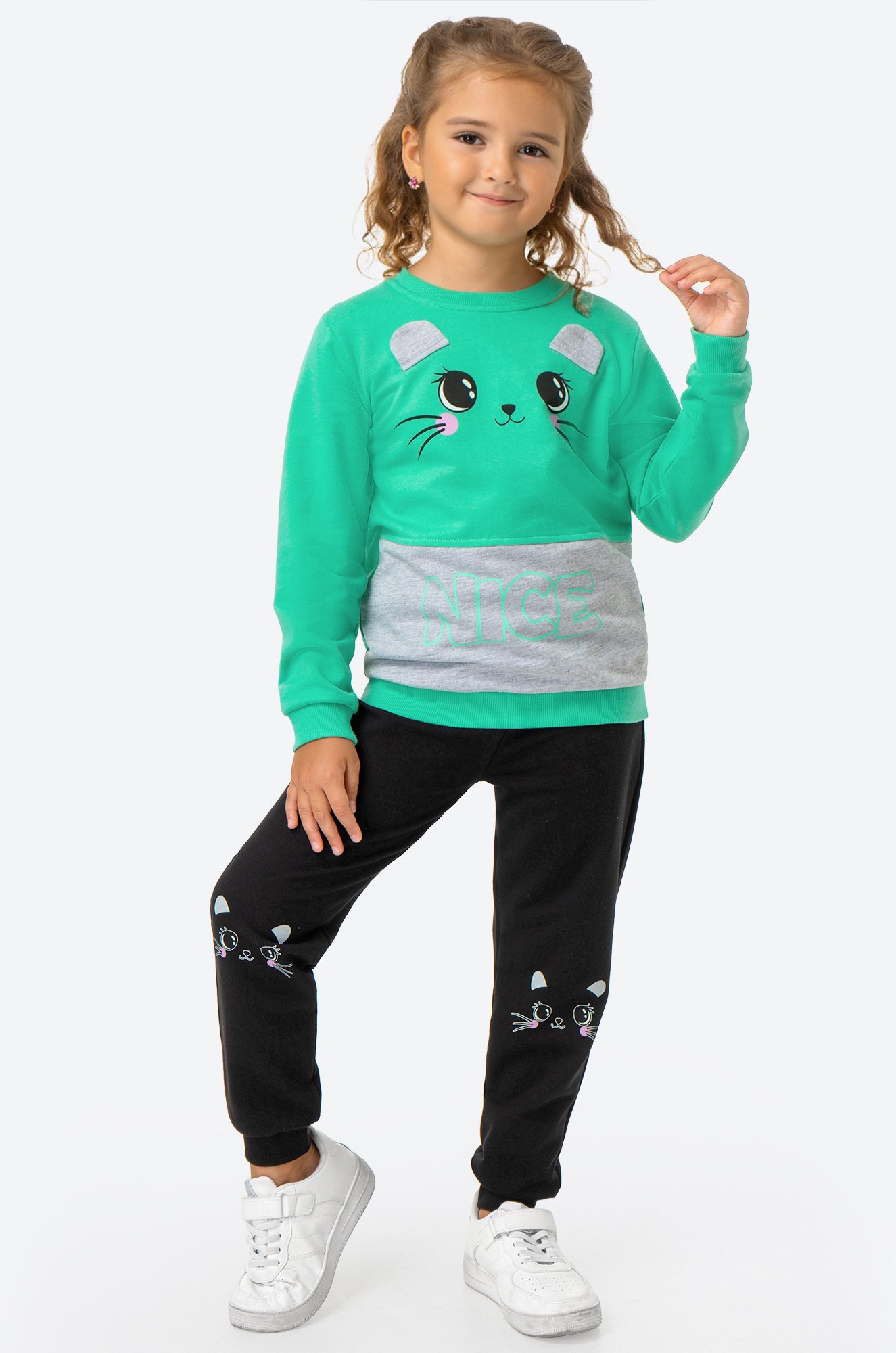 Ярко встречаем осень с невероятно удобным и уютным детским костюмом для девочки. В комплекте свитшот прямого кроя и штаны на манжетах. Костюм выполнен из 100% хлопка и украшен забавным принтом с пришивными ушками.