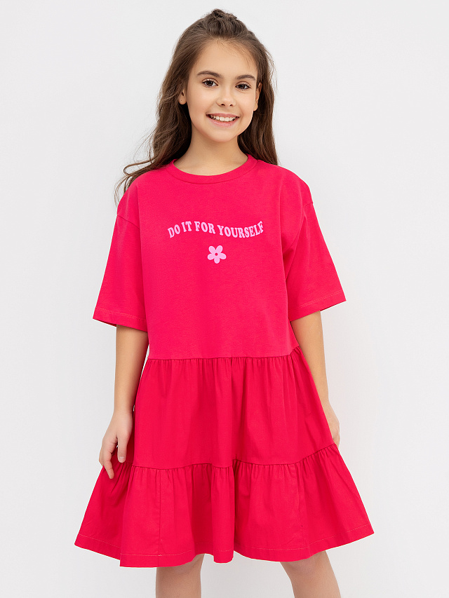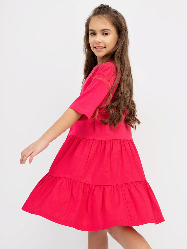 Многоярусное платье силуэта оверсайз малинового цвета для девочек