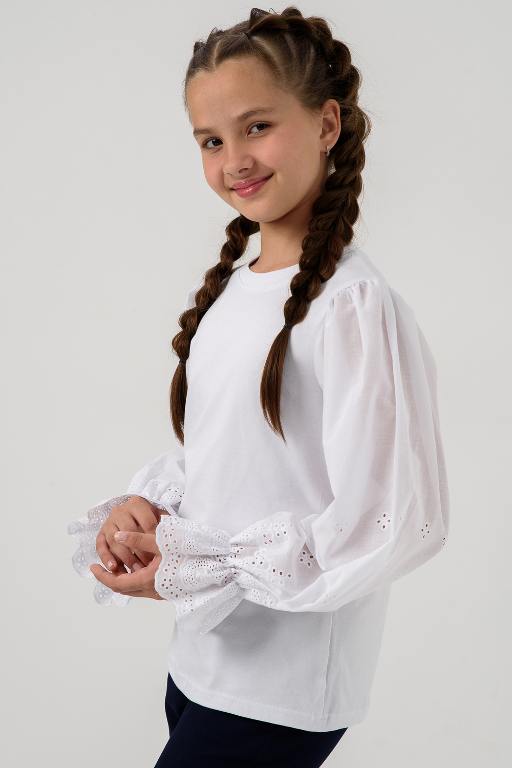 Школьная блузка с длинными, пышными рукавами, выполненными из хлопковой ткани шитье. Джемпер украсит и дополнит любой образ в школу. Красивый джемпер для девочек подростков на каждый день. Цвет: белый; Материал: кулирка с лайкрой; Состав: 92% хлопок 8% лайкра.