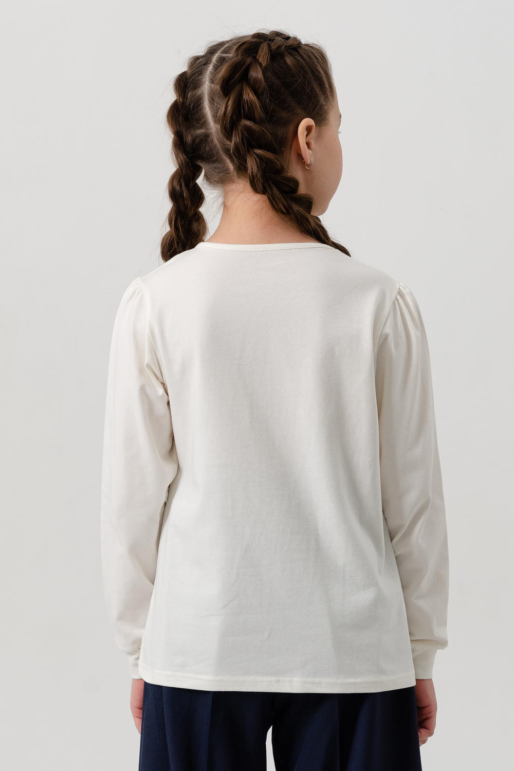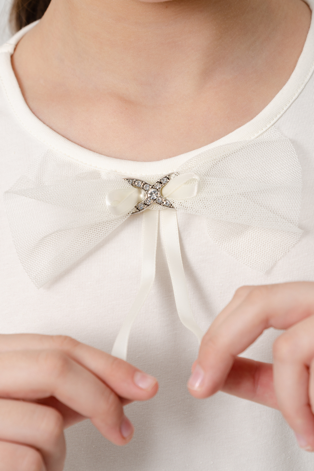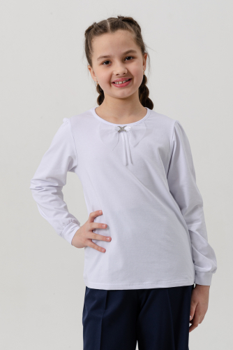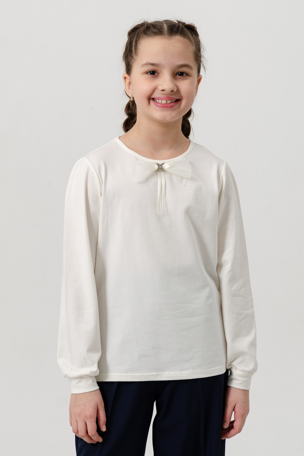 Блузка школьная для девочки с трикотажными длинными рукавами, круглым вырезом горловины, без застёжки, прилегающего силуэта, по центру переда настрочен бант из сетки, спереди прикреплен съёмный декоративный элемент, рукава на манжетах. Сшита из однотонного мягкого хлопкового трикотажного материала с добавлением в состав хлопка 92% и лайкры 8%. Школьная форма украсит и дополнит любой образ не только в школу, но и для повседневной носки, на день рождения, фотосессию и для особых случаев. Блузка отлично сидит по фигуре, движения в нем комфортные, позволяет выглядеть ребенку изящно. Хорошо смотрится в сочетании с юбками, сарафанами, брюками, со школьным костюмом, отлично сохраняют цвет и форму при активной носке и после многократных стирок. Используемый материал блузки мягкий и приятный телу, устойчив к износу, не садится, не образует катышек на поверхности, имеет эффектный внешний вид. Цвет: белый;экрю; Материал: кулирка с лайкрой;кулирка с лайкрой; Состав: 92% хлопок, 8% лайкра.