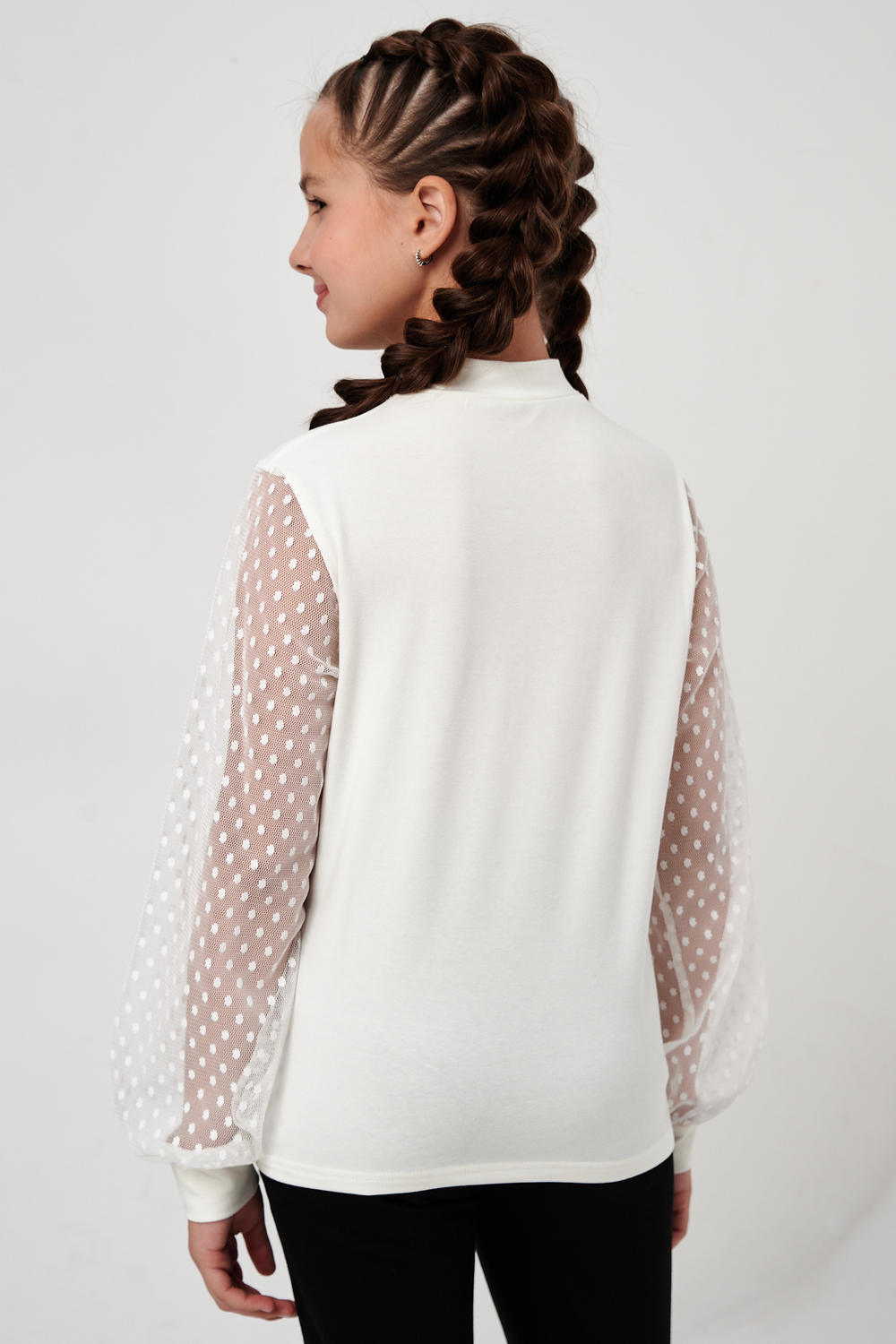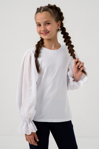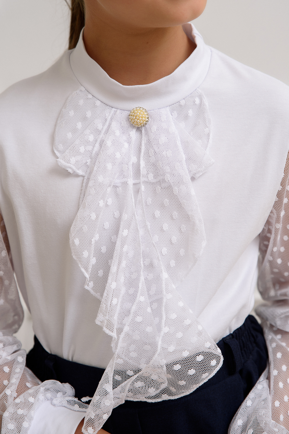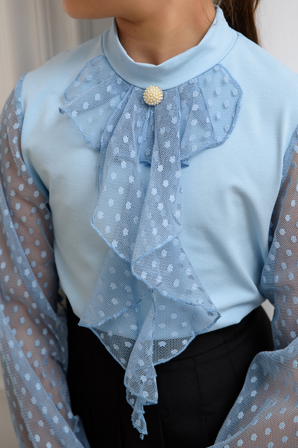 Блузка школьная для девочек с длинными рукавами из фатина. Красивый джемпер для девочек с жабо на каждый день. Цвет: белый;голубой;пудра;экрю; Материал: кулирка с лайкрой;фатин; Состав: Основа: 92% Хлопок 8% лайкра Отделка: 100% ПЭ.