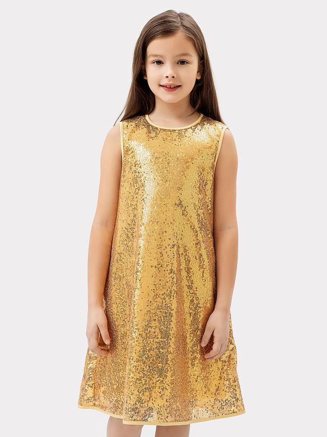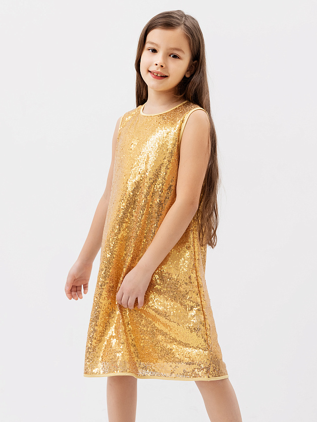 Нарядное платье без рукавов в золотистые пайетки для девочек