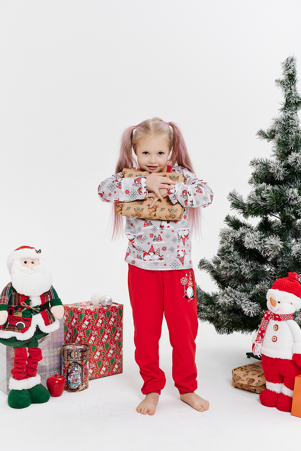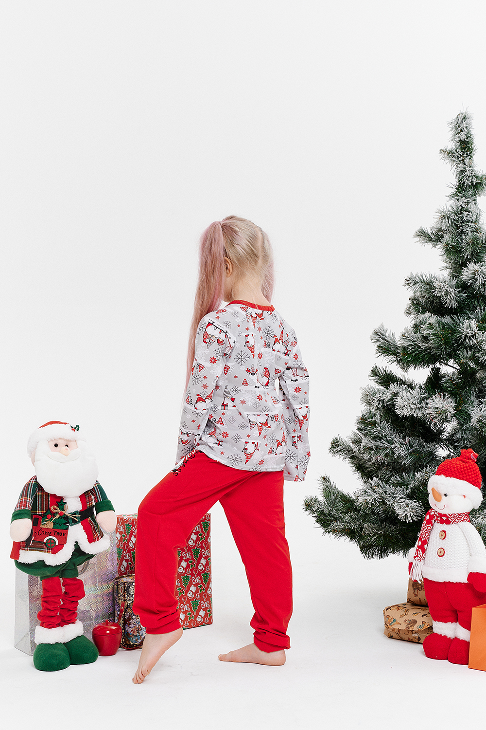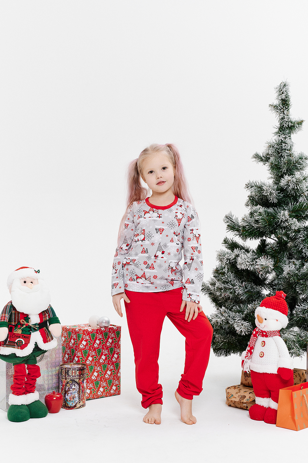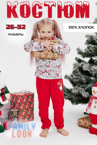 Костюм детский для девочек из кулирного полотна состоит из кофты и брюк. Кофта прямая, горловина круглая, обработана окантовкой, рукав длинный, реглан, низ изделия обработан на плоскошовной машине. Брюки прямые, верх на поясе с резинкой, спереди на брюках принт, низ изделия на плоскошовной машине. Данный костюм из серии Family look, к нему можете приобрести женский костюм: 42275, детский костюм для мальчиков: 42277, мужской костюм: 42274. Цвет: красный; Материал: кулирка;кулирка; Состав: 100% хлопок.