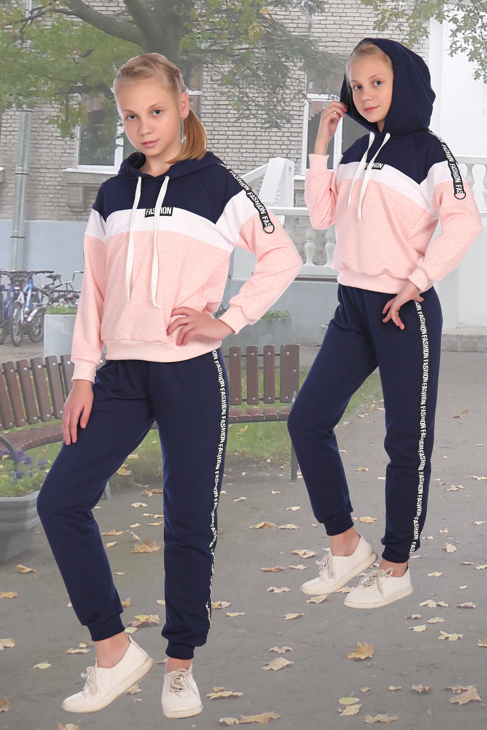 Подростковый спортивный костюм. Свободны брюки на манжете. Кофта средней длины, капюшон регулируется шнурком. Для отделки используется лента с надписью.