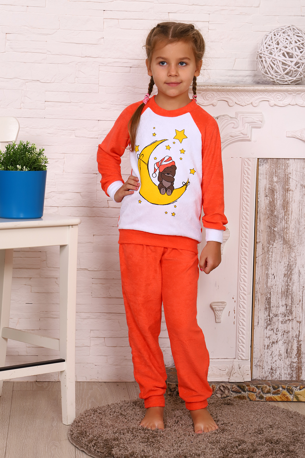 Костюмчик домашний из мягкой махры на девочку. Брючки прямые на манжете, кофточка рукав реглан на поясе, впереди печать