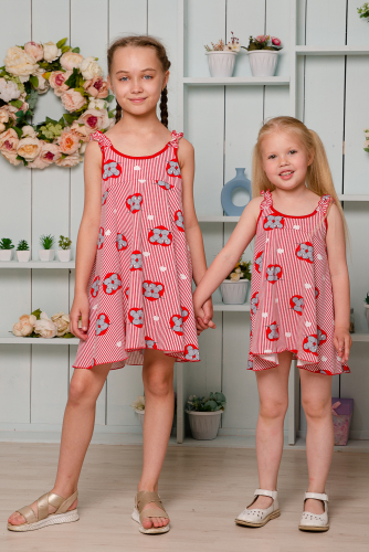 Костюм детский летний. Коротенький топ с шортами. Топ короткий, расклешенный с завышенной линией талии по переду, на широких бретельках из основной ткани, собранных в сборку на резинку. Низ топа обработан декоративной краеобметочной строчкой. Шорты с завышеной линией талии, на широкой резинке, шорты оформлены декоративным поясом со шлевками. Низ обработан притачными манжетами с отворотом.
